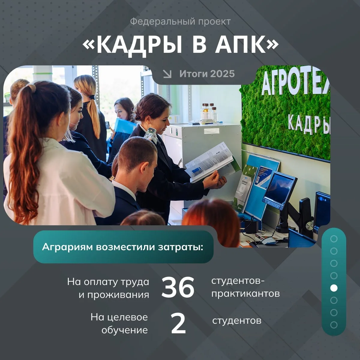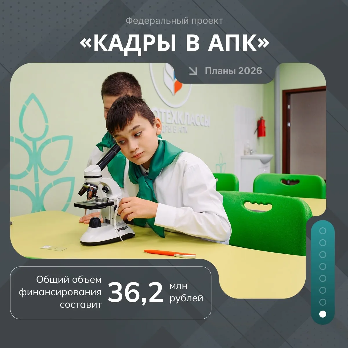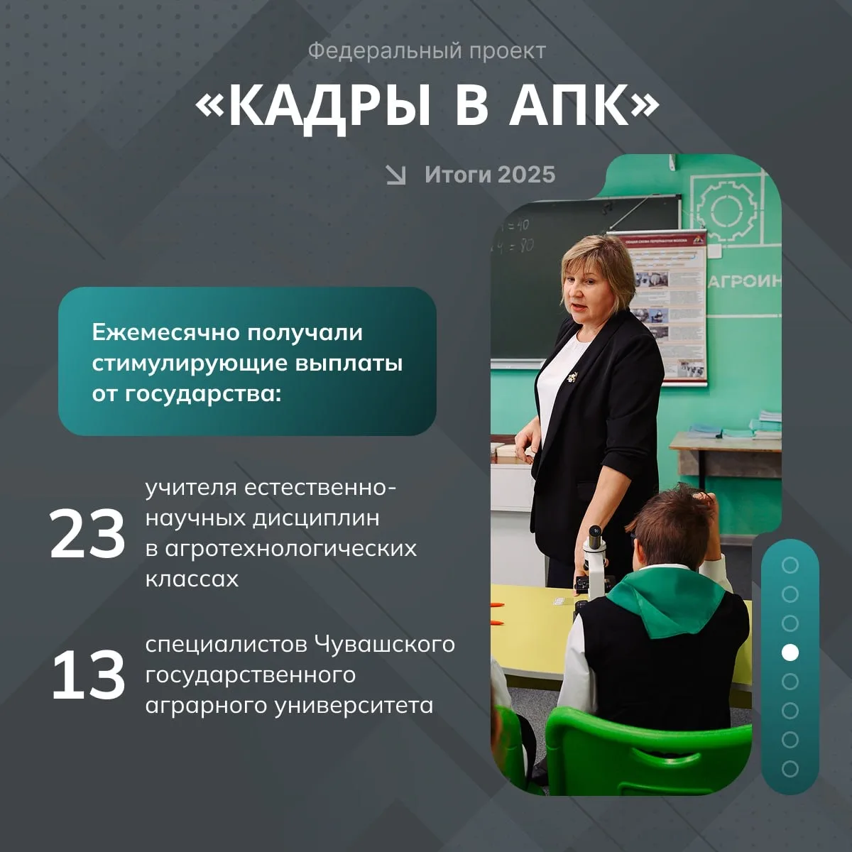 Агротехклассы в школах, стимулирующие выплаты учителям и преподавателям, компенсация оплаты студенческой практики аграриям. 🌱Всё это – федеральный проект «Кадры в АПК» нацпроекта «Технологическое обеспечение продовольственной безопасности».