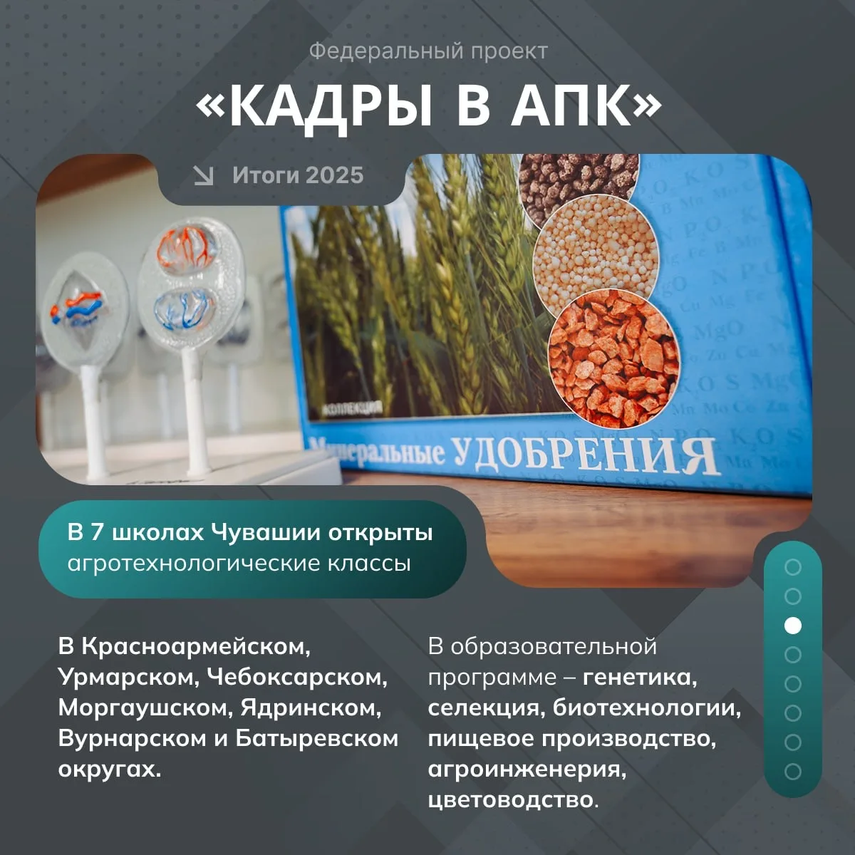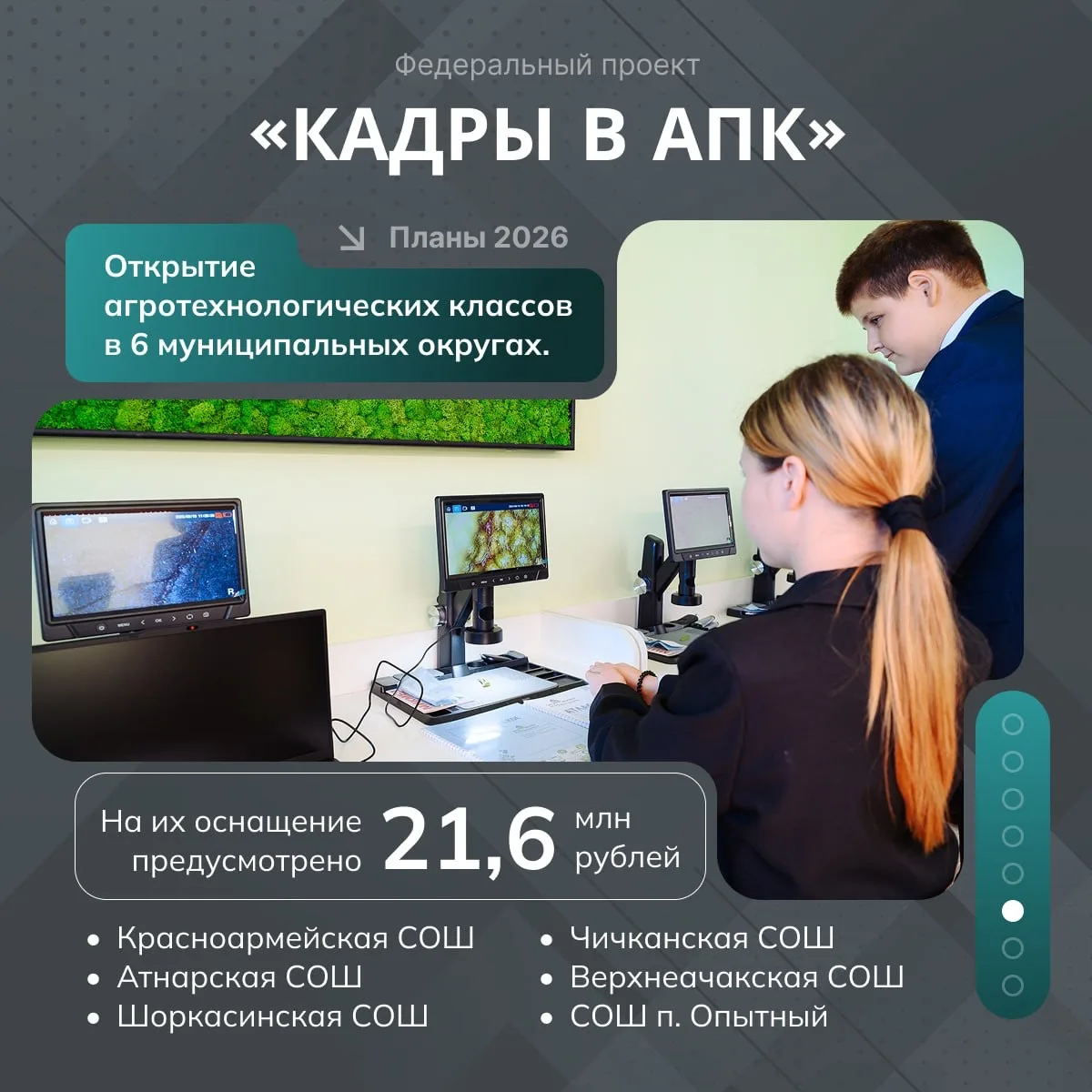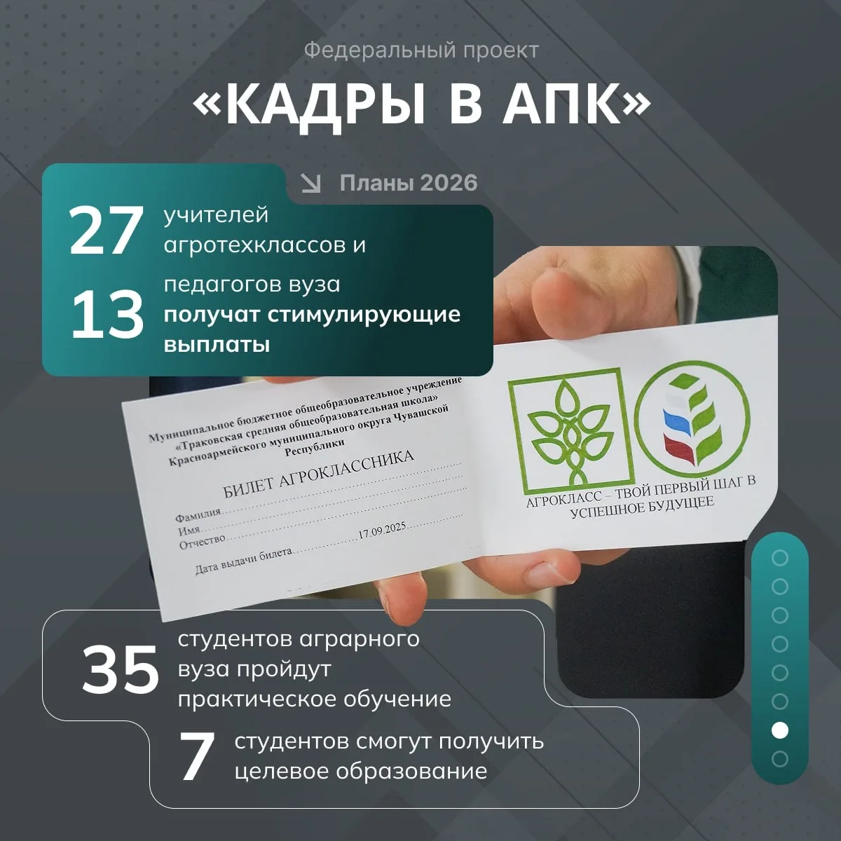 Агротехклассы в школах, стимулирующие выплаты учителям и преподавателям, компенсация оплаты студенческой практики аграриям. 🌱Всё это – федеральный проект «Кадры в АПК» нацпроекта «Технологическое обеспечение продовольственной безопасности».