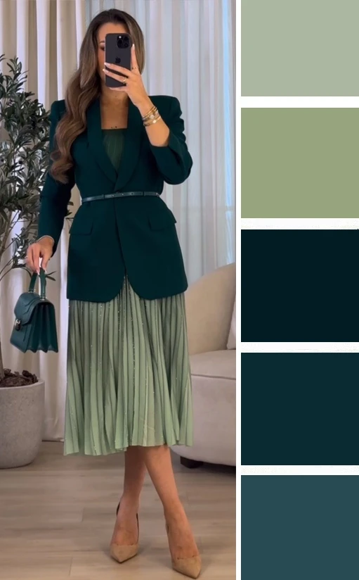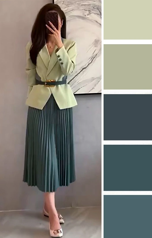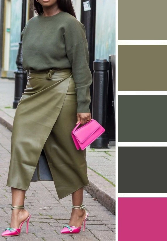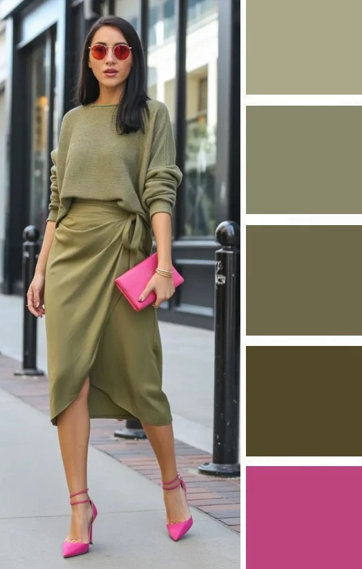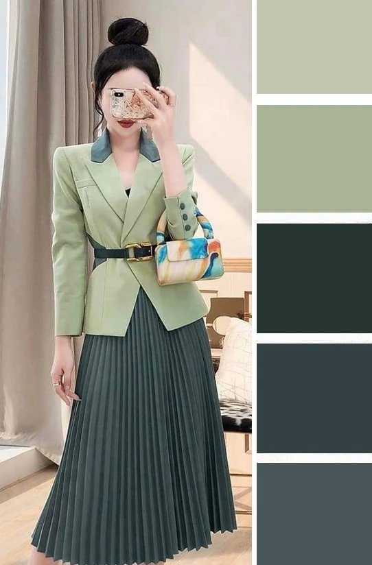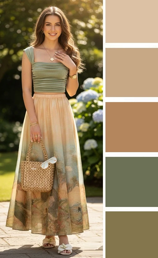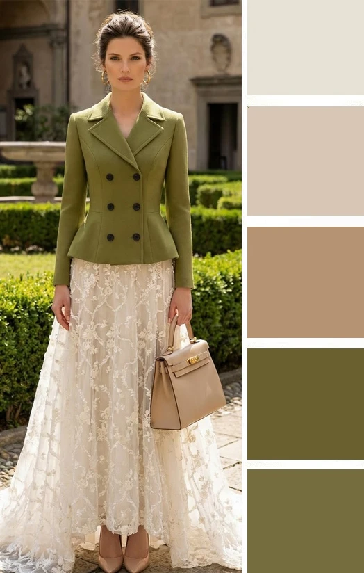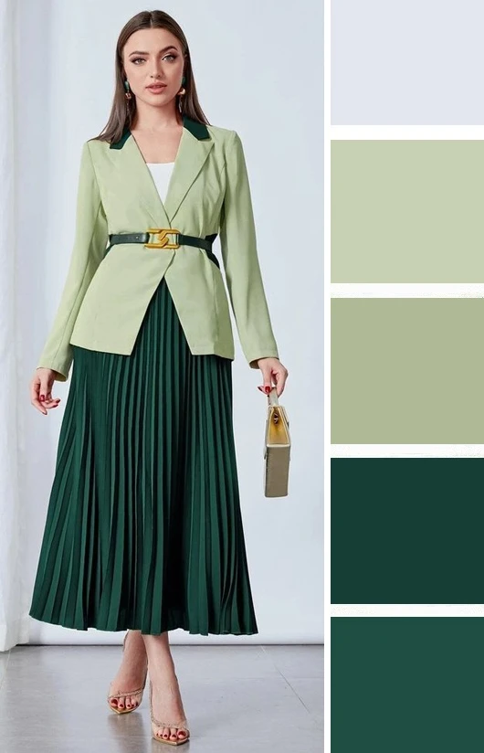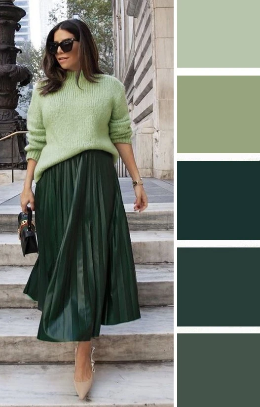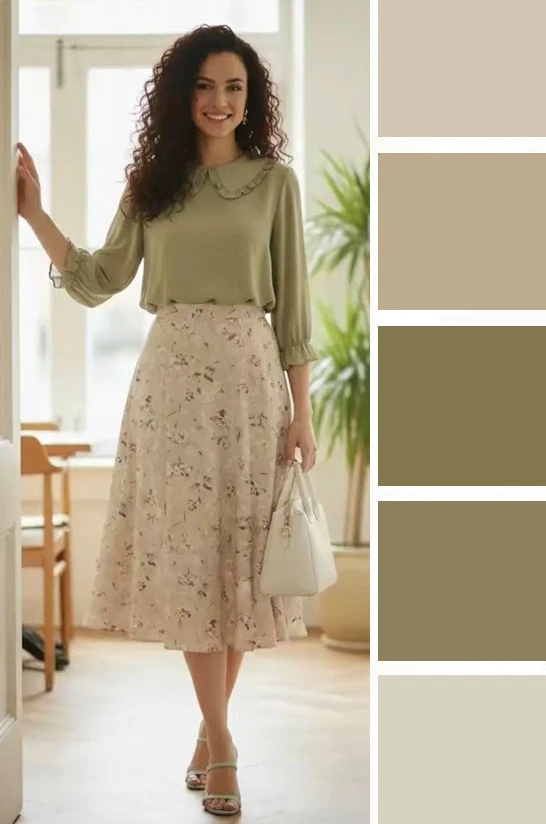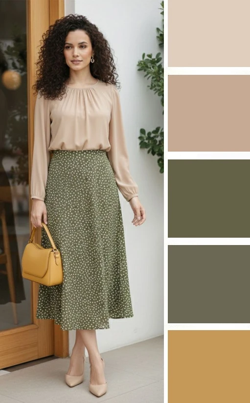 Мягкие зеленые оттенки и светлый бежевый — это легкое и уютное сочетание, которое преображается в юбках и блузках, создавая скромное очарование. Дополнить палитру можно желтым, коричневым.