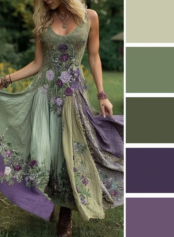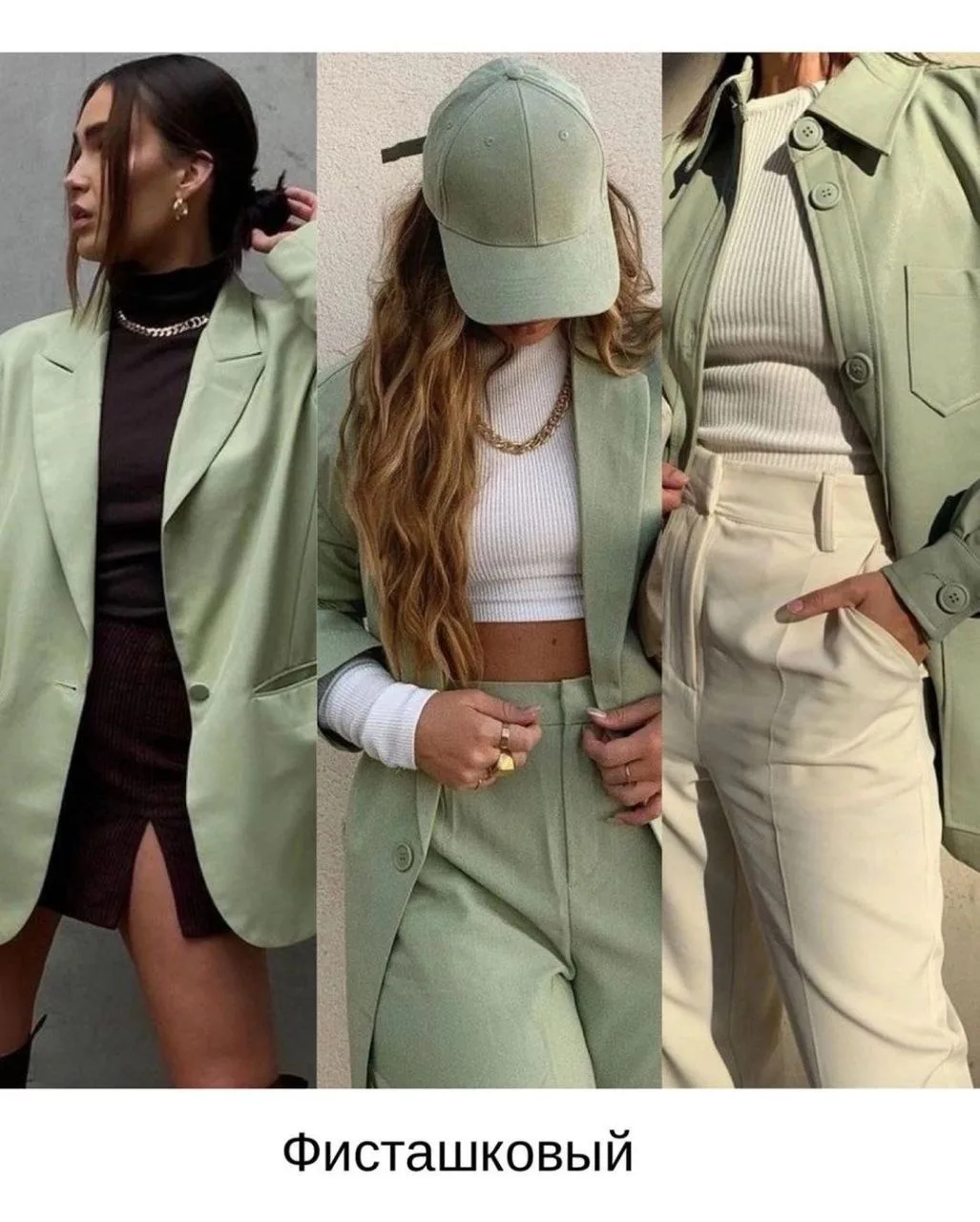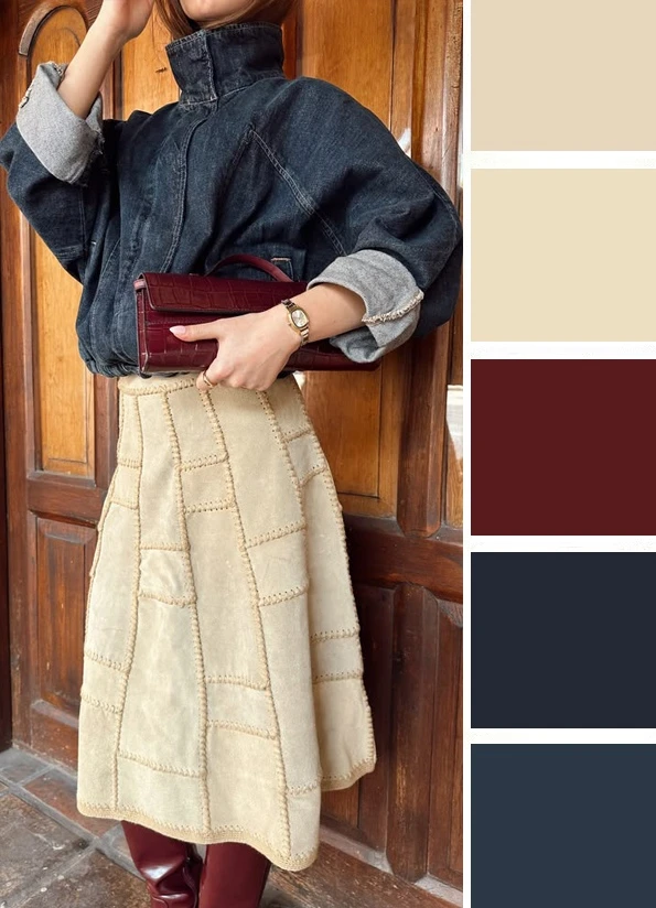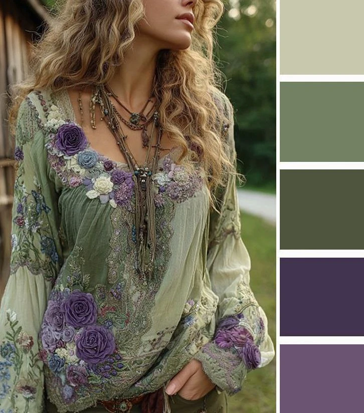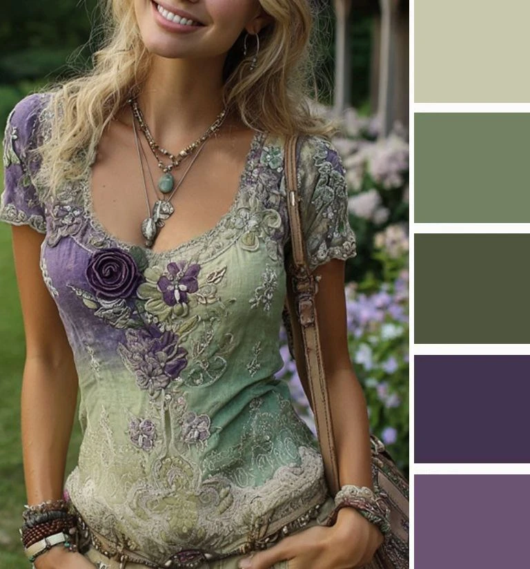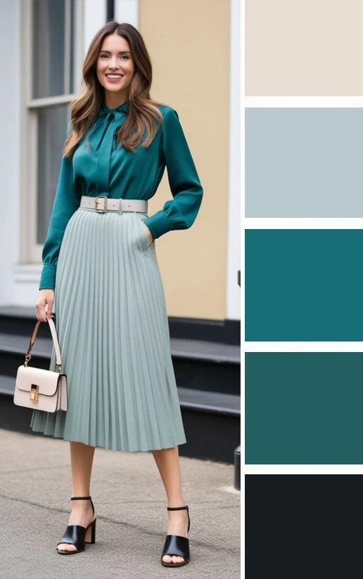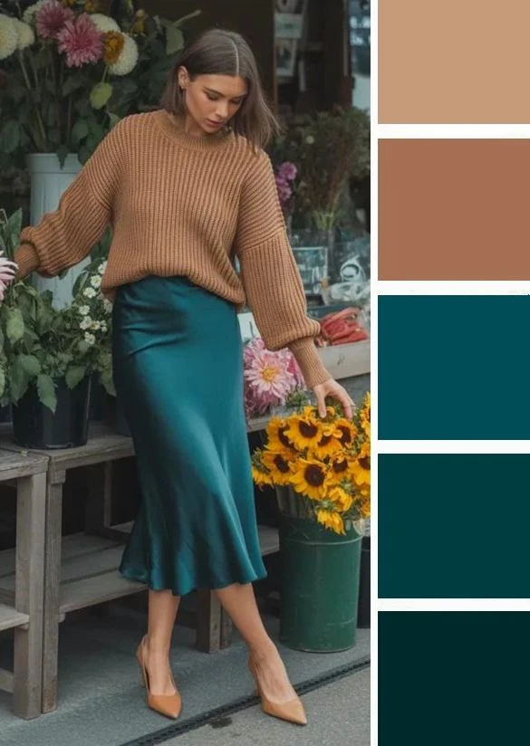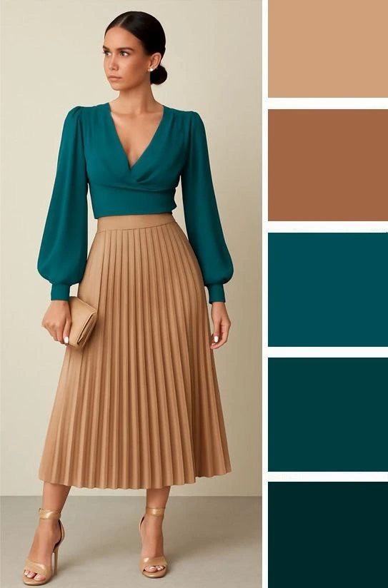 Мягкие зеленые оттенки и светлый бежевый — это легкое и уютное сочетание, которое преображается в юбках и блузках, создавая скромное очарование. Дополнить палитру можно желтым, коричневым.