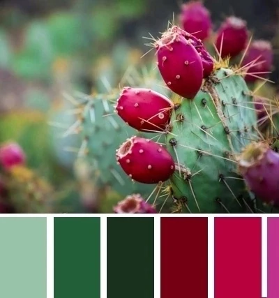 Лиственно-зеленые тона и акцент цвета фуксия — это динамичное сочетание, которое выглядит прогрессивно и запоминающе. Дополнить палитру можно белым, черным, коричневым.