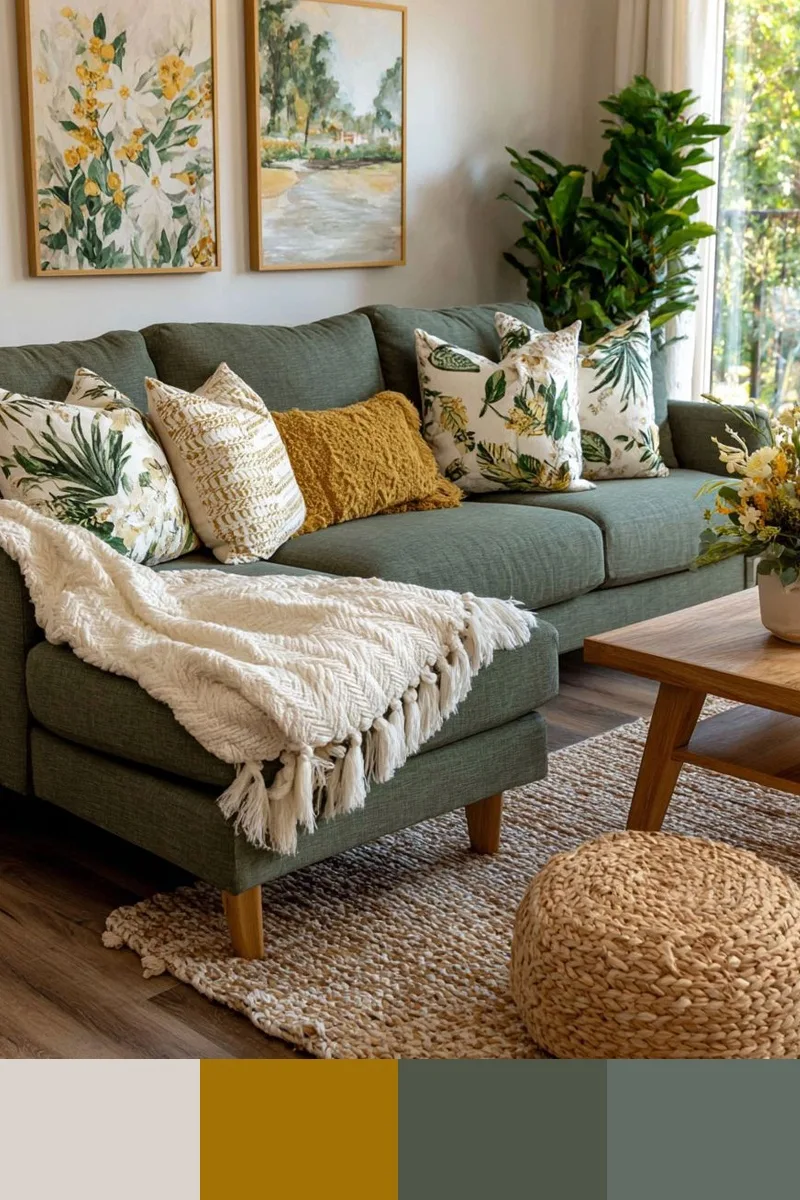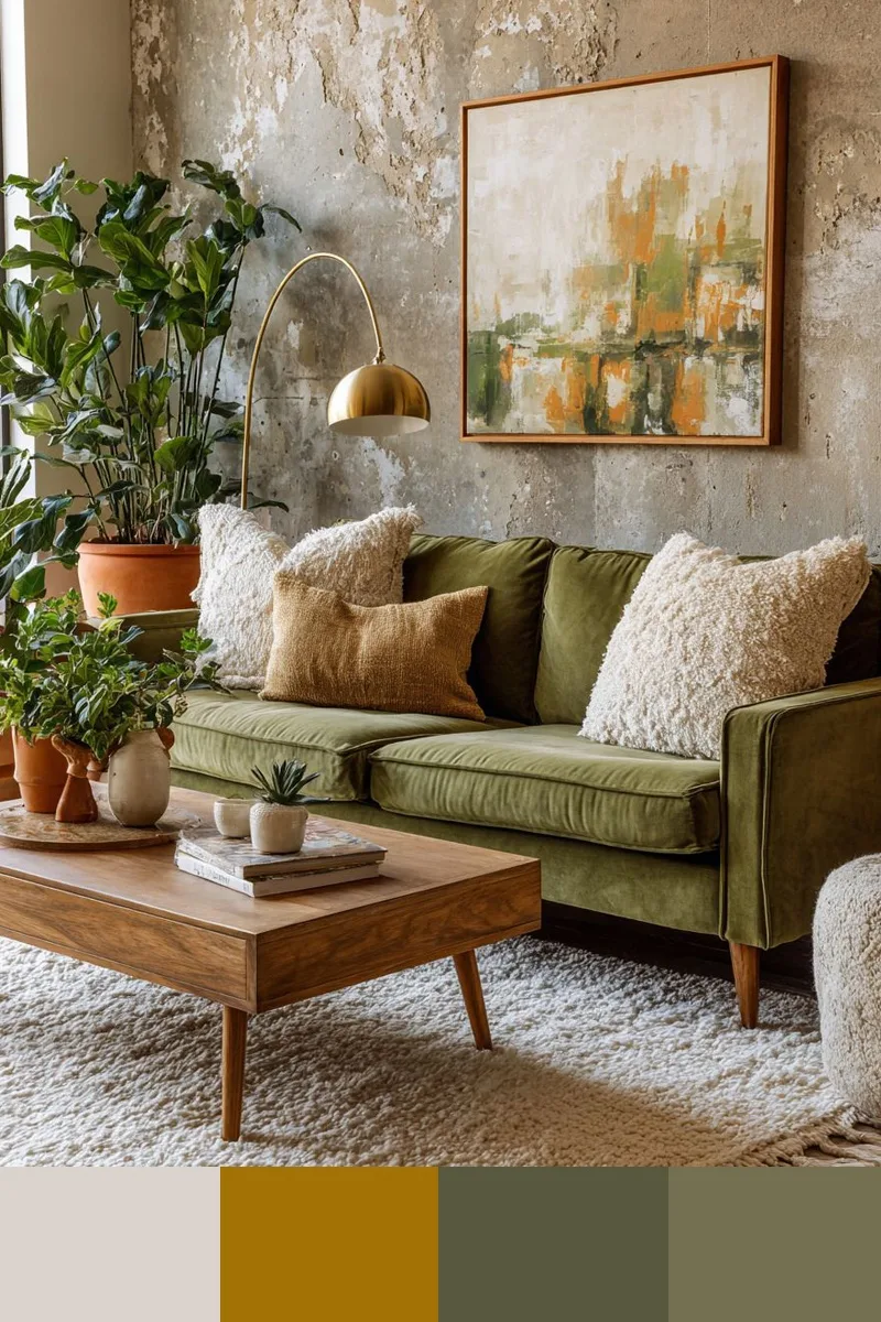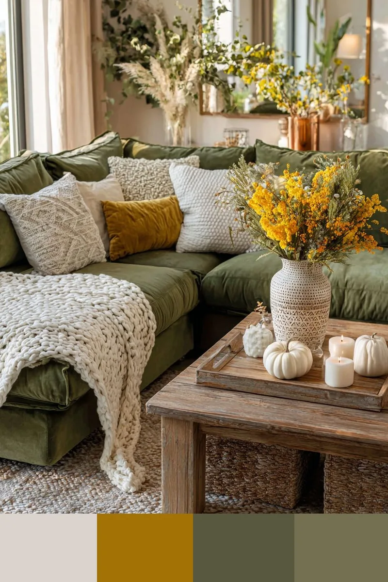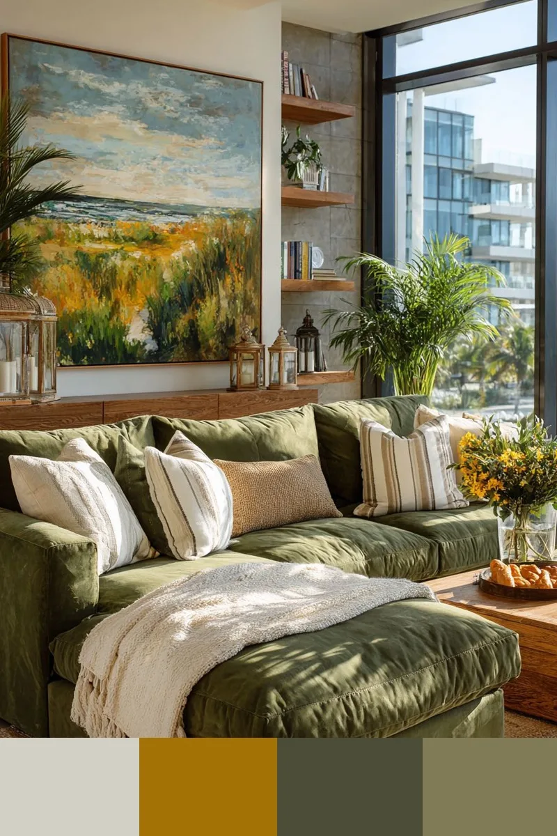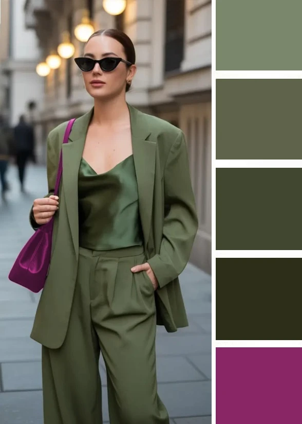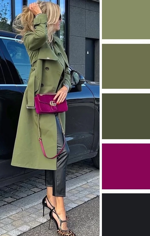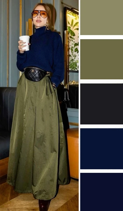 Теплые оливково-зеленые тона с горчичными акцентами — это весенняя гамма, теплая и юная. Ее можно сочетать с белым, бежевым, коричневым, так она наполнится простором и контрастом.