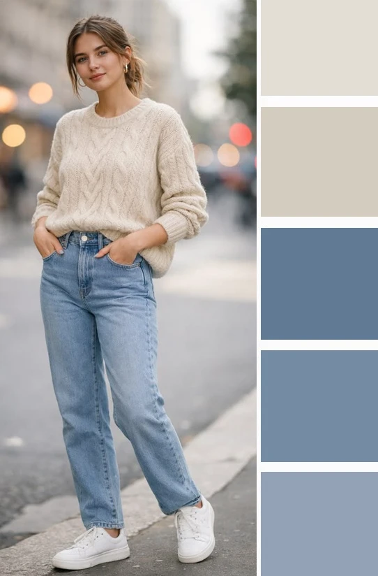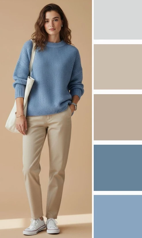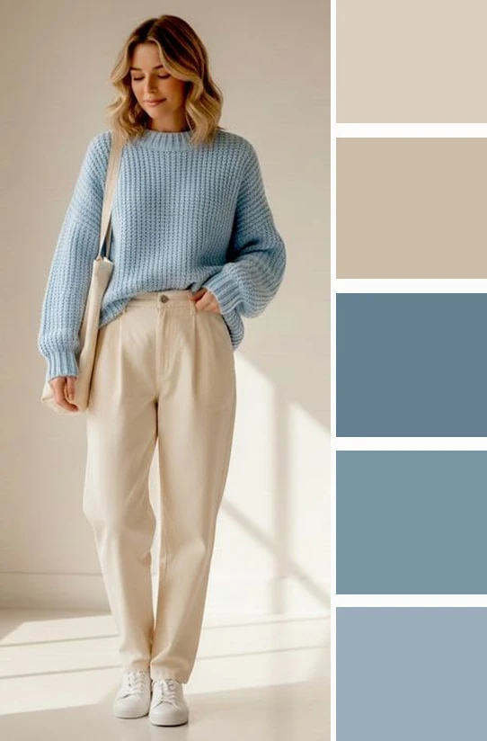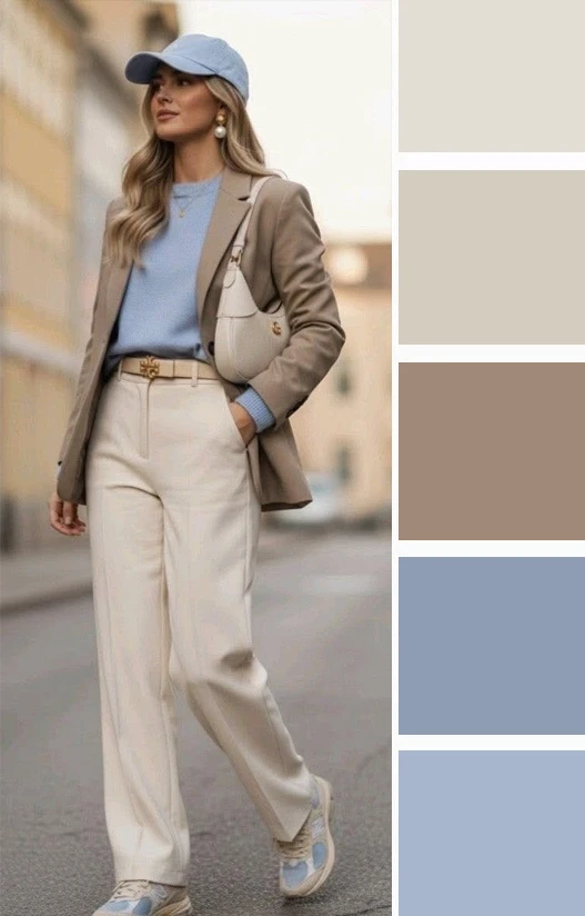 Кремовые и светло-бежевые оттенки рядом с нежно-голубым цветом в одежде создают невероятно мягкую, воздушную и успокаивающую гамму, напоминающую о безоблачном небе и песчаном пляже. Это сочетание дарит образу свежесть, легкость и аристократичную сдержанность, делая его идеальным для романтичных встреч и летних прогулок, где хочется выглядеть утонченно и естественно.
