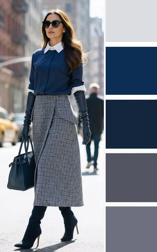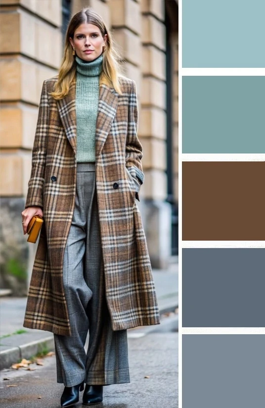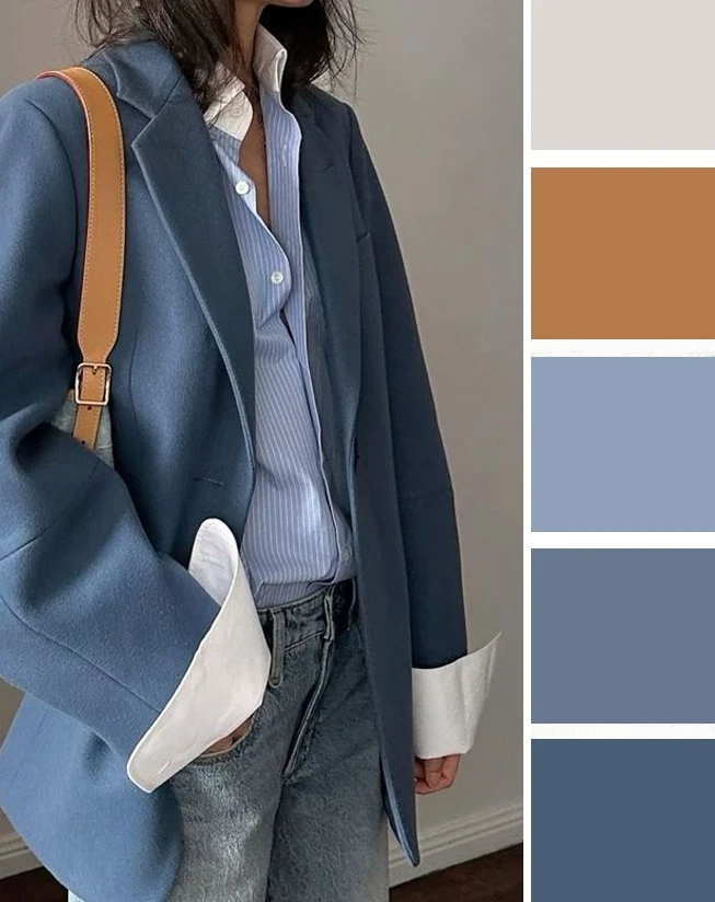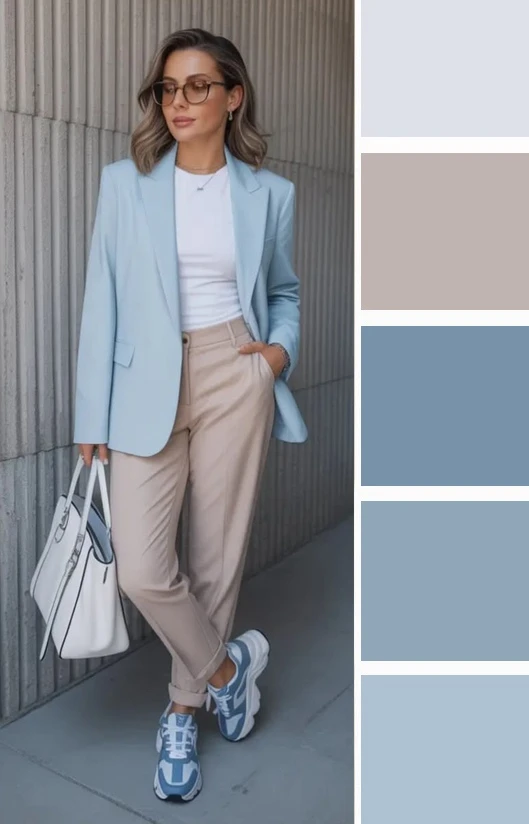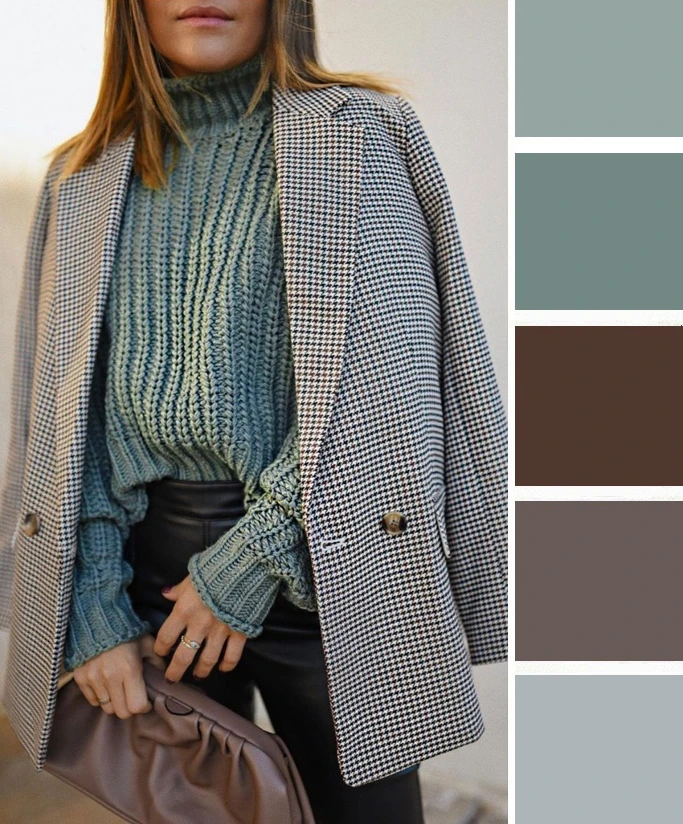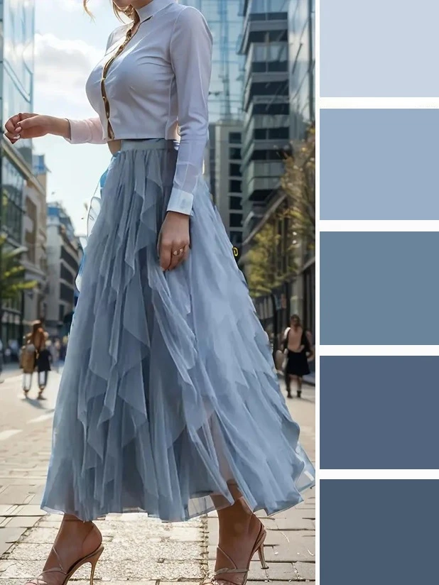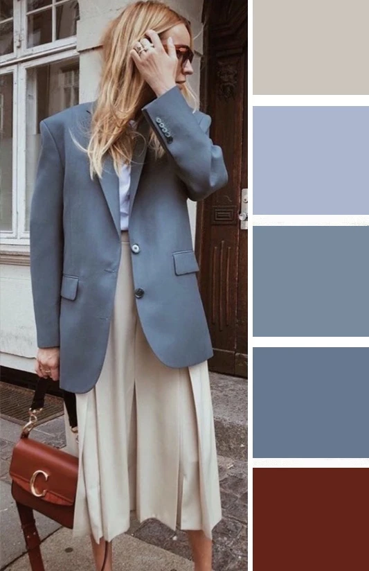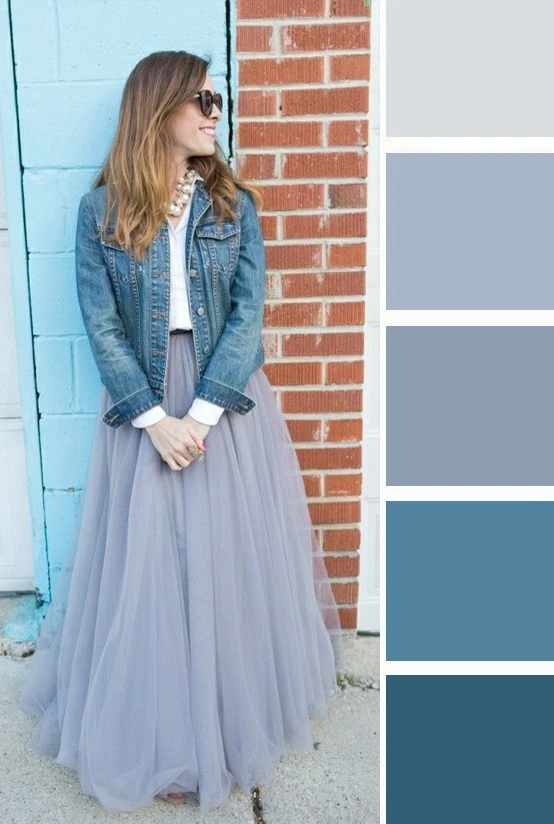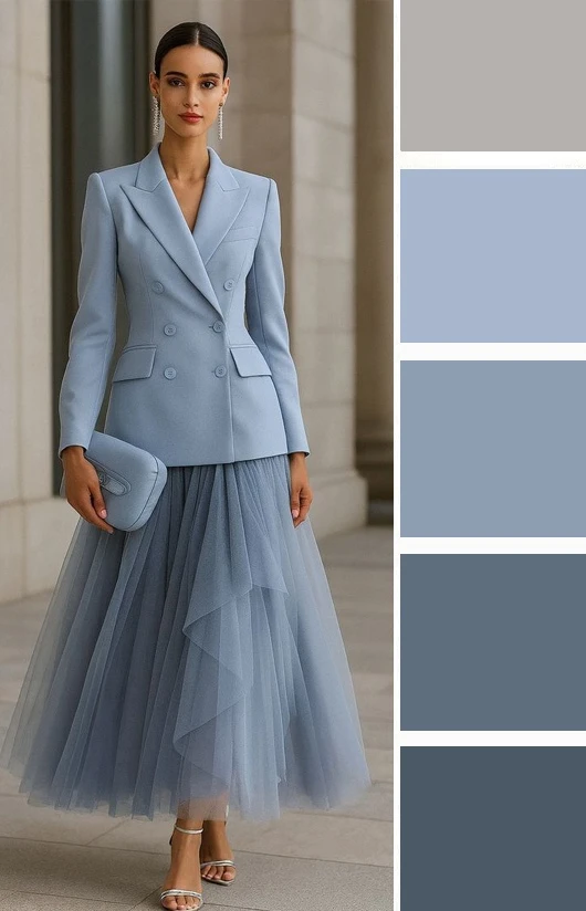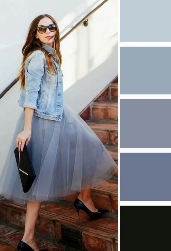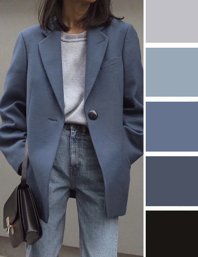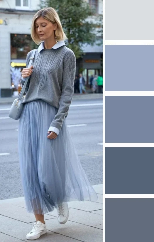 Серо-голубой оттенок в одежде — это мягкий, туманный и универсальный выбор. Он освежает лицо, придает образу изысканную сдержанность и спокойную элегантность. Дополнить палитру можно белым, черным, джинсово-голубым.