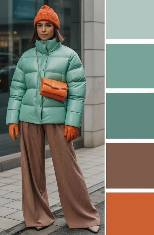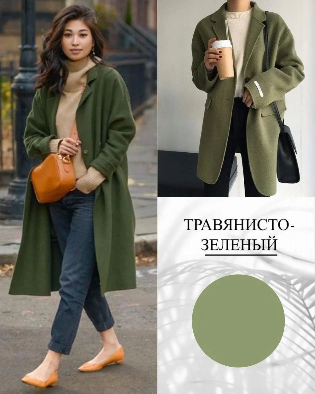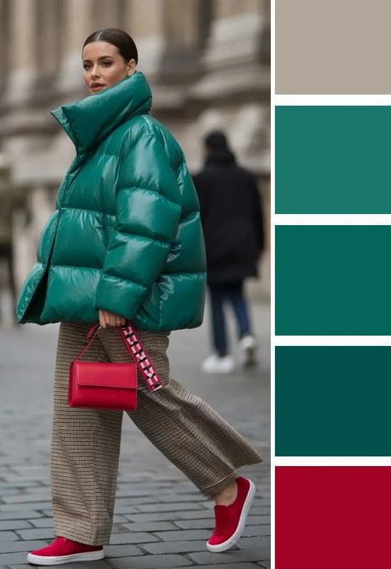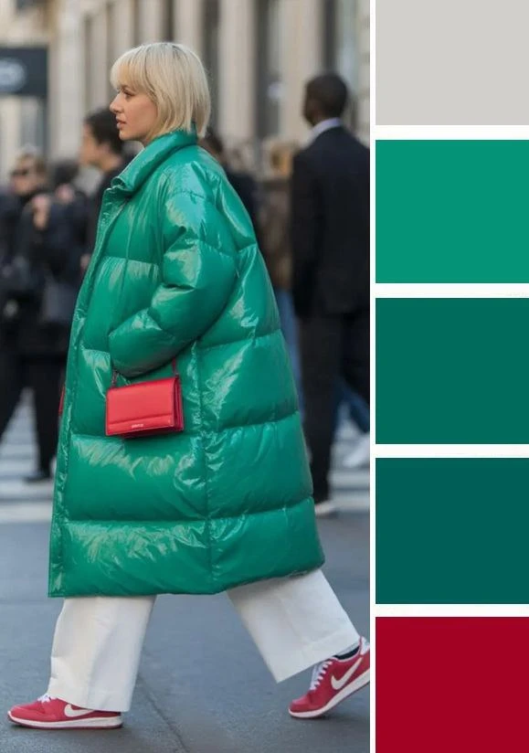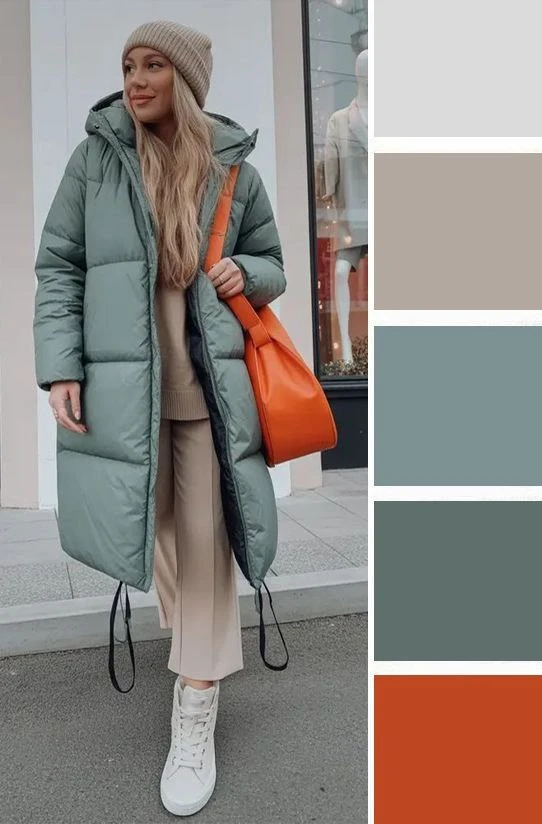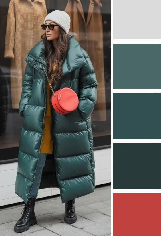 Холодные оттенки зеленого в пуховиках выглядят сочно и позитивно, но этот эффект всегда можно усилить, добавив в образ яркий теплый акцент красного или оранжевого цвета. Дополнить палитру можно светло-коричневым, бежевым, белым, черным. А какой образ вам больше нравится?