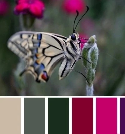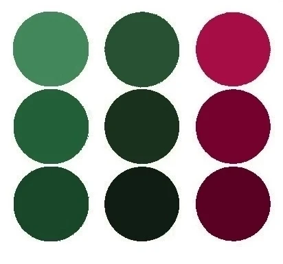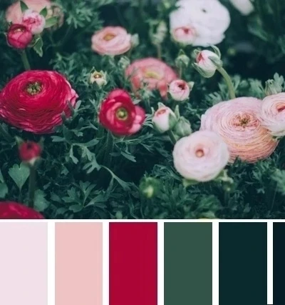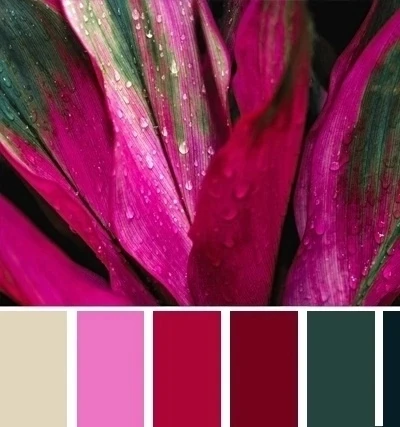 Ягодный и темно-зеленый цвет - густое и вкусное сочетание, которое построено на контрасте предельно удаленной паре - эффектное, выразительное. Продолжить палитру можно более светлым зеленым, розовым, бежевым.