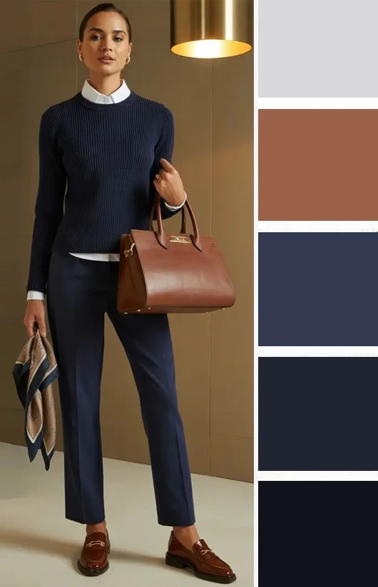 Темно-синий цвет в одежде смотрится строго и привлекательно. Его можно сочетать с голубым, светло-коричневым, серым, черным, бордовым, оливковым, коричневым. А какой вариант нравится вам?