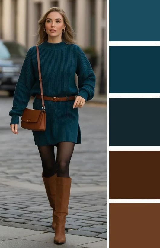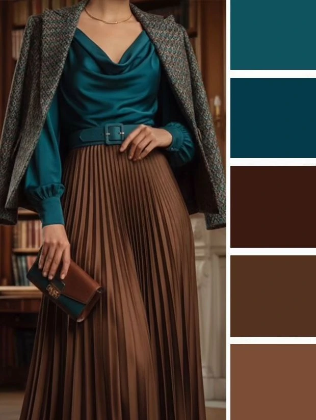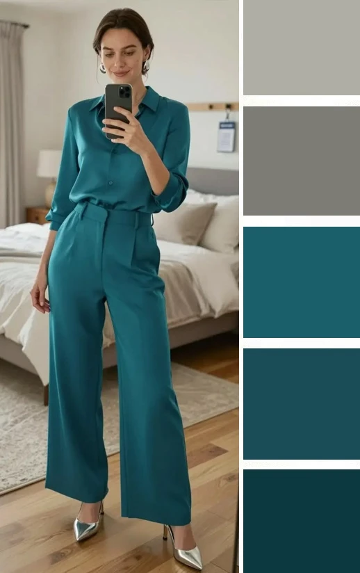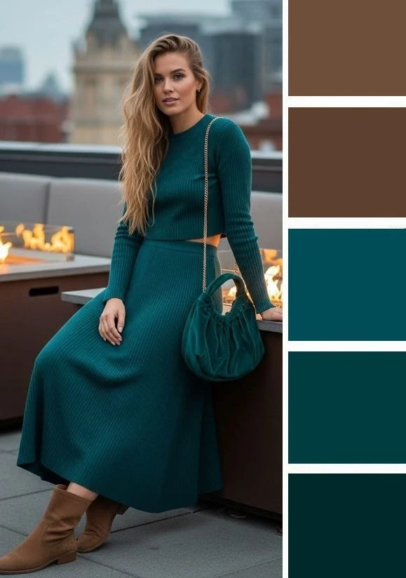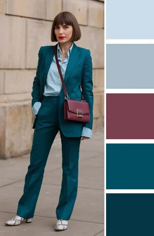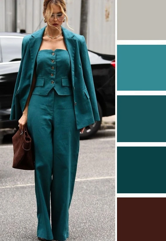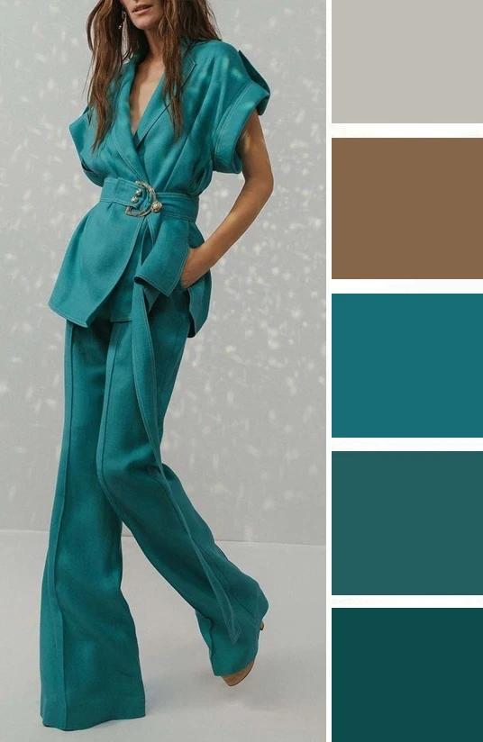 Густые бирюзовые тона в одежде поражают своей выразительностью и насыщенностью, но в отличие от теплых тонов они не раздражают, а придают образу благородство и уверенность в себе. Их можно сочетать с голубым, мятным, бордовым, белым, золотым.
