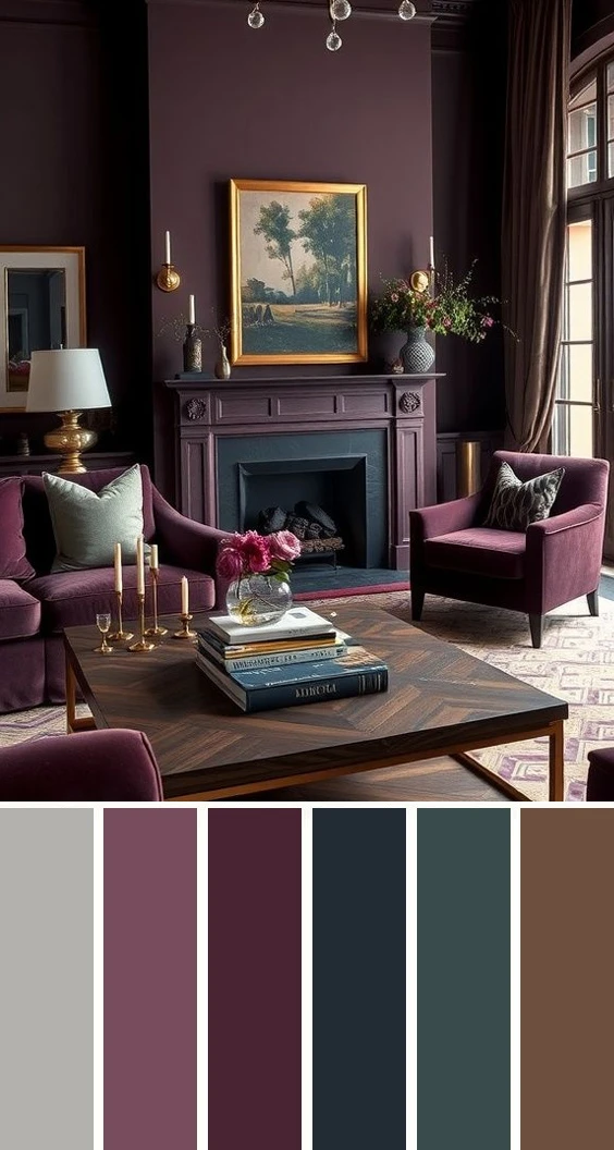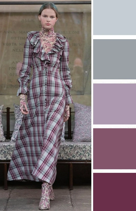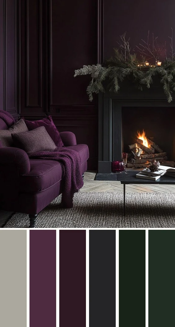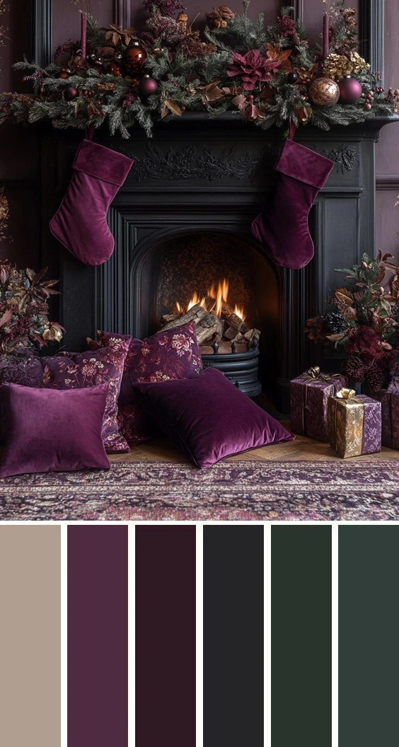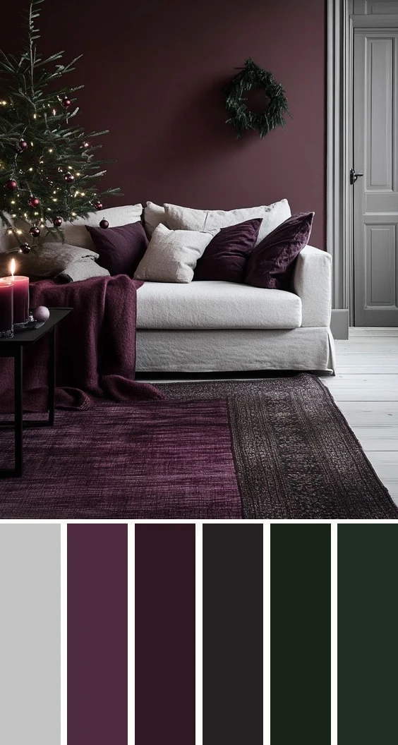 Сливовые и баклажановые тона в сочетании с тёмно-серым и хвойной зеленью — это глубокая, торжественная и волшебная гамма, которая создаёт ощущение замкнутого, уютного пространства, наполненного счастьем и праздником. Дополнить палитру можно золотым, бежевым, серым и коричневым.