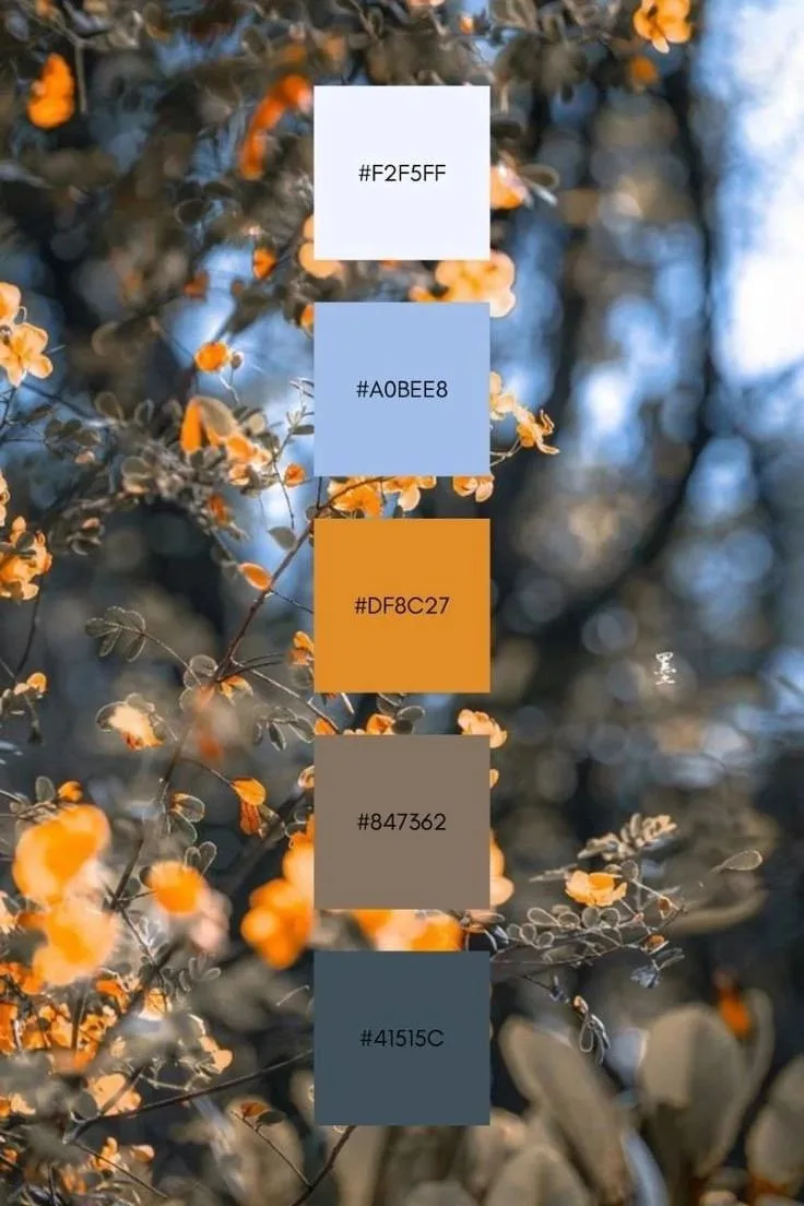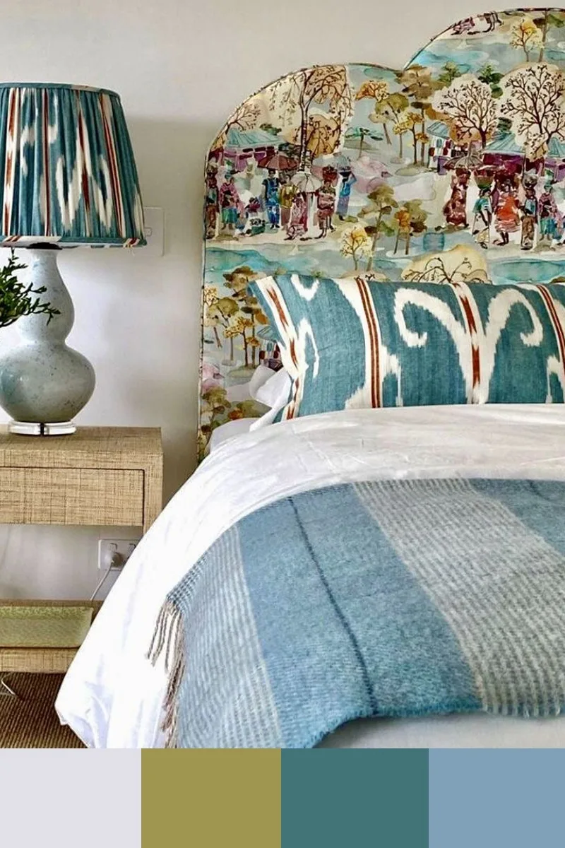 Бирюзовые оттенки и жёлто-оранжевая гамма — приятная композиция, построенная на контрасте, спокойная и атмосферная. Можно дополнить палитру коричневым, бежевым и золотым цветами.