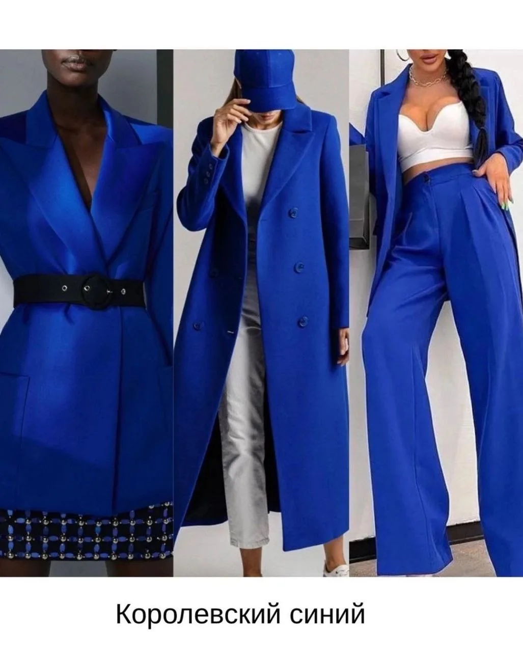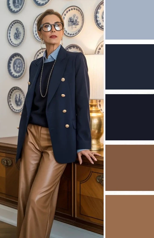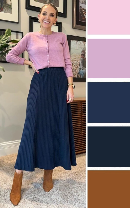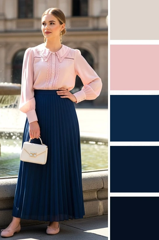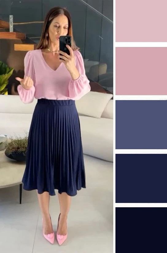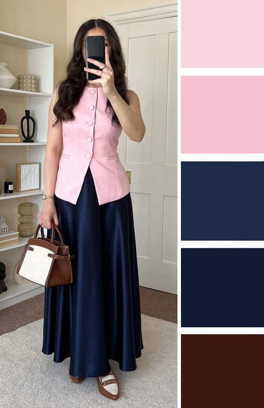 Тёплые и прохладные оттенки розового и тёмно-синий цвет — это контрастное сочетание, где розовый не выглядит слащавым за счёт синего, создавая сбалансированный образ. Дополнить палитру можно белым и коричневым.