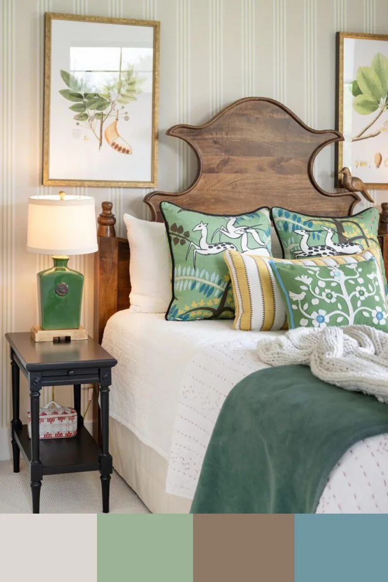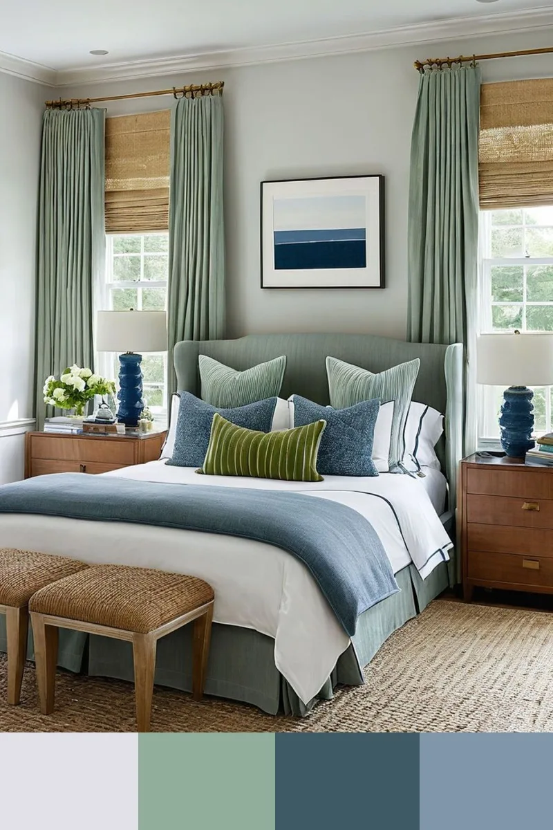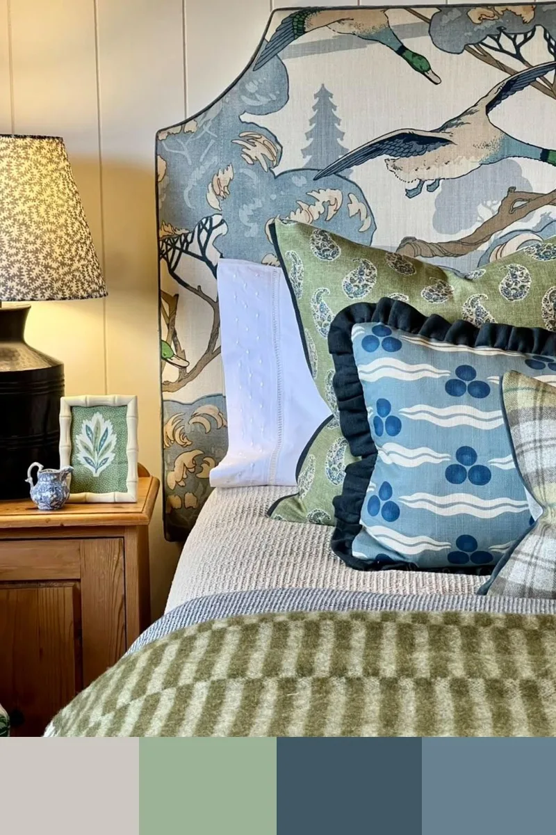 Мягкие зеленые тона и синяя гамма — это сочное сочетание родственных оттенков, которое выглядит гармонично и по-природному свежо. Дополнить палитру можно белым, бежевым, коричневым, бледно-желтым.