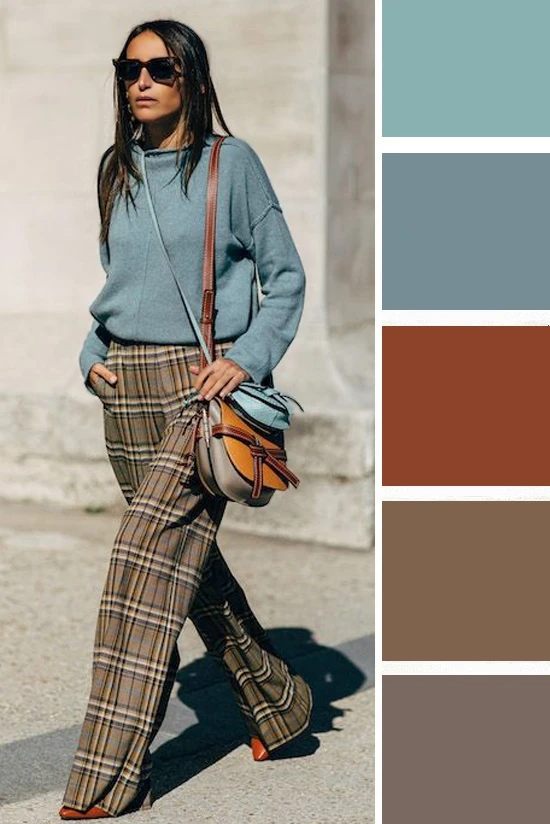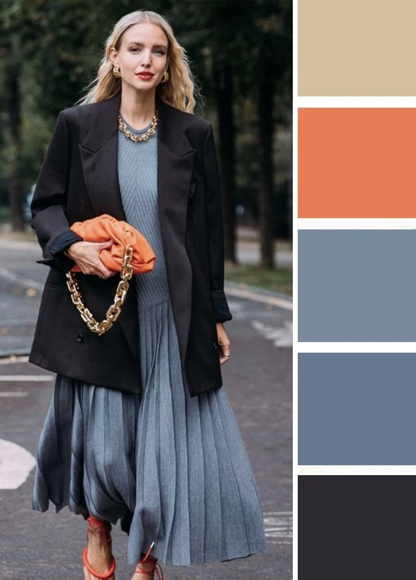 Серо-синий тон в одежде выглядит как базовый элемент, который помогает раскрыться не контрастной внешности. Сочетать его можно с оранжевым, молочно-белым, черным, коричневым. А какой вариант нравится вам?