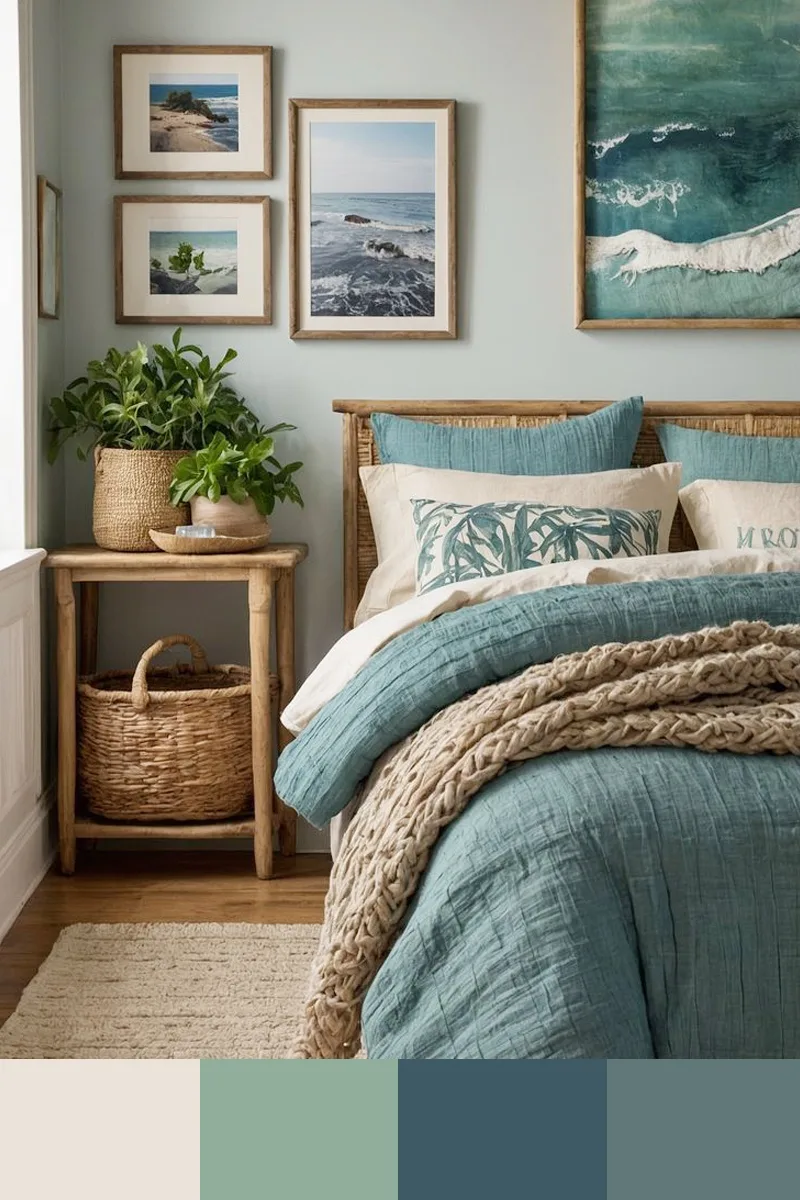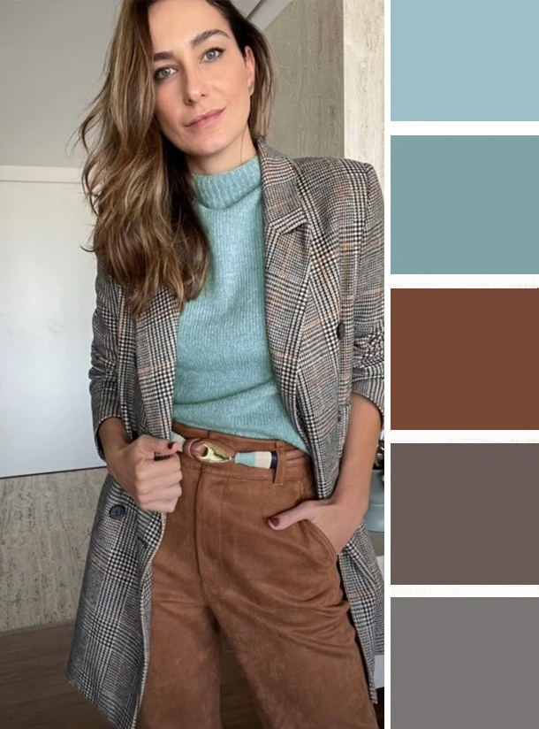 Серо-бирюзовые, теплые серые и коричнево-бежевые тона — это гармоничная, уравновешенная палитра, где сложный оттенок бирюзы создает изюминку. Дополнить палитру можно золотым, голубым, темно-синим.
