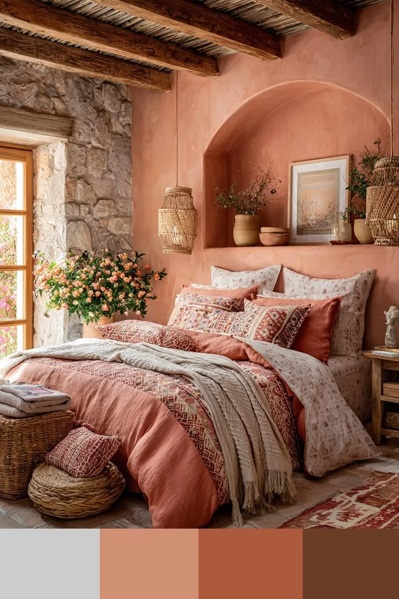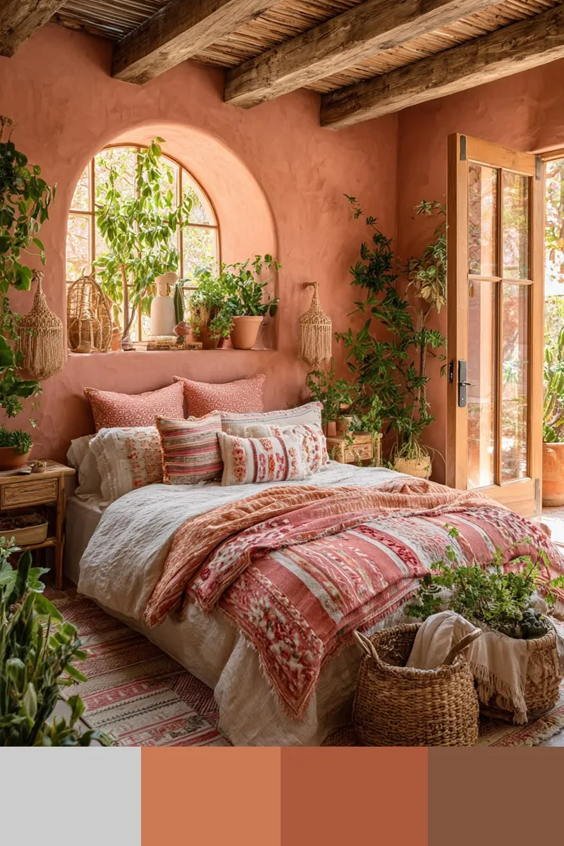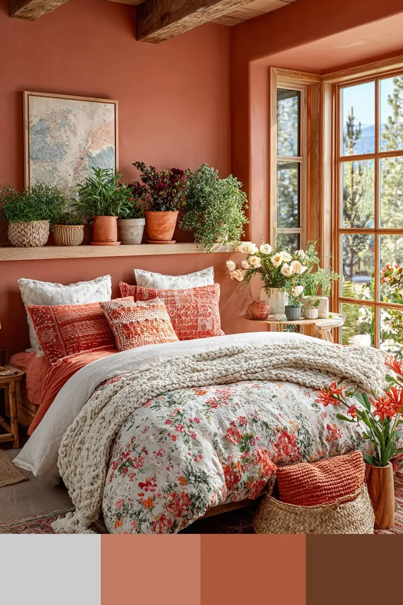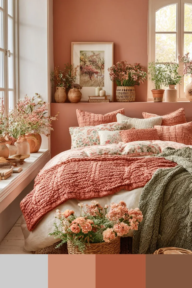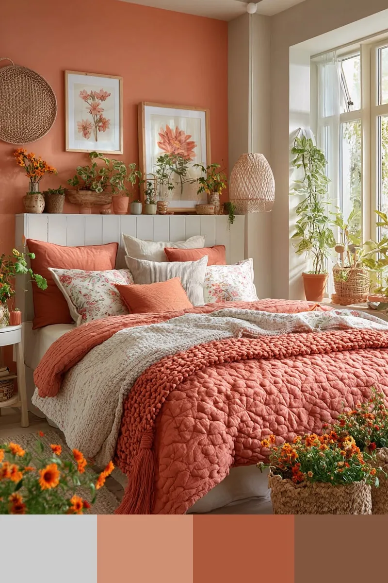 Коралловый и коричневый — это мягкое и теплое сочетание, наполненное светом и ощущением солнца. Дополнить палитру можно лиственно-зеленым, белым, бежевым.