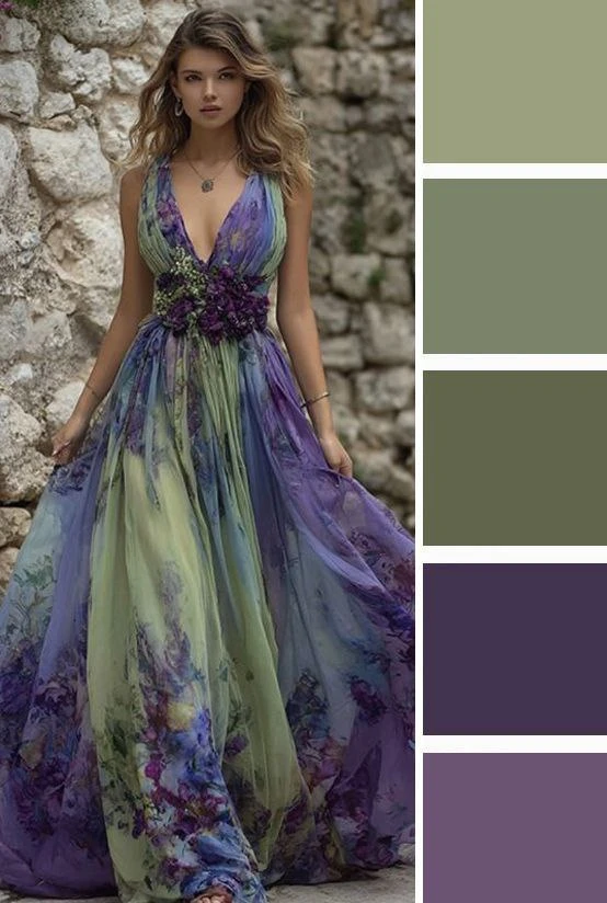 Сине-зеленые, желто-зеленые и персиковые оттенки — это тонкая весенняя гамма цветочного цветения. Глубокая зеленая тень и согретая на солнце зелень отлично оттенятся теплым и нежным персиковым тоном. Дополнить палитру можно белым, серым, бежевым, черным.