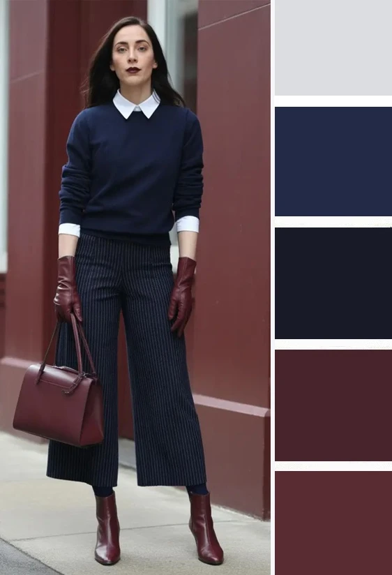 Винные оттенки и синие тона — гармоничная и мягкая комбинация. Оттенки похожи по светлоте, но различаются по яркости, хотя и незначительно. Для дополнения палитры подойдут бежевый, коричневый, чёрный и золотой цвета.