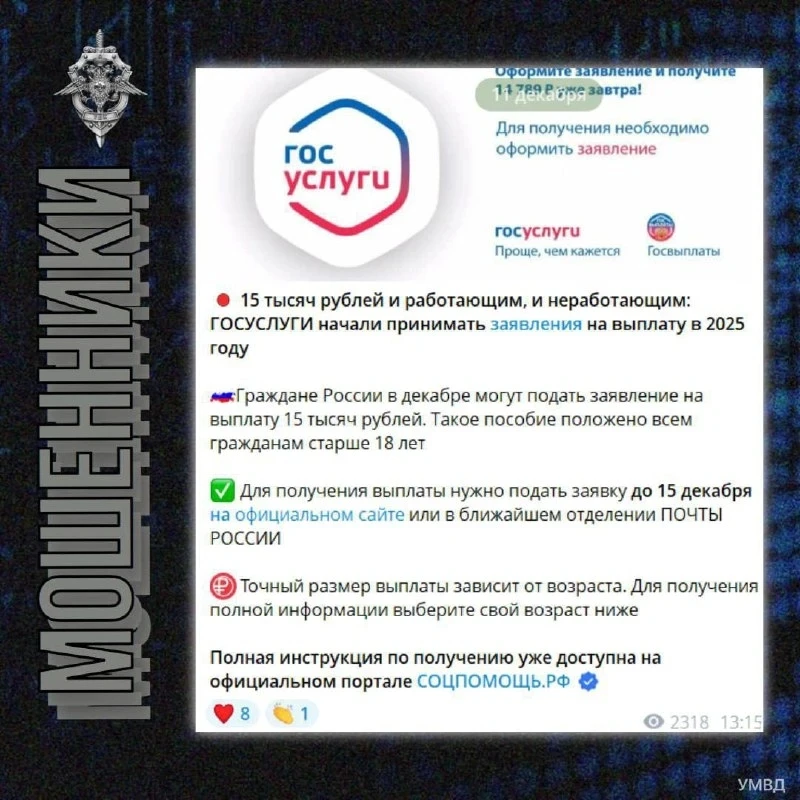 Мошенники массово атакуют россиян фейковыми сообщениями о выплатах по 15.000₽ от «Госуслуг». Речь идёт о якобы декабрьских выплатах, которые «положены» всем россиянам старше 18 лет. Чтобы получить их, предлагают подать заявку до 15 декабря. В результате людей перенаправляют на мошеннические сайты с нелегальными казино, фейковыми инвестиционными проектами и вирусами для кражи персональных данных и денег.