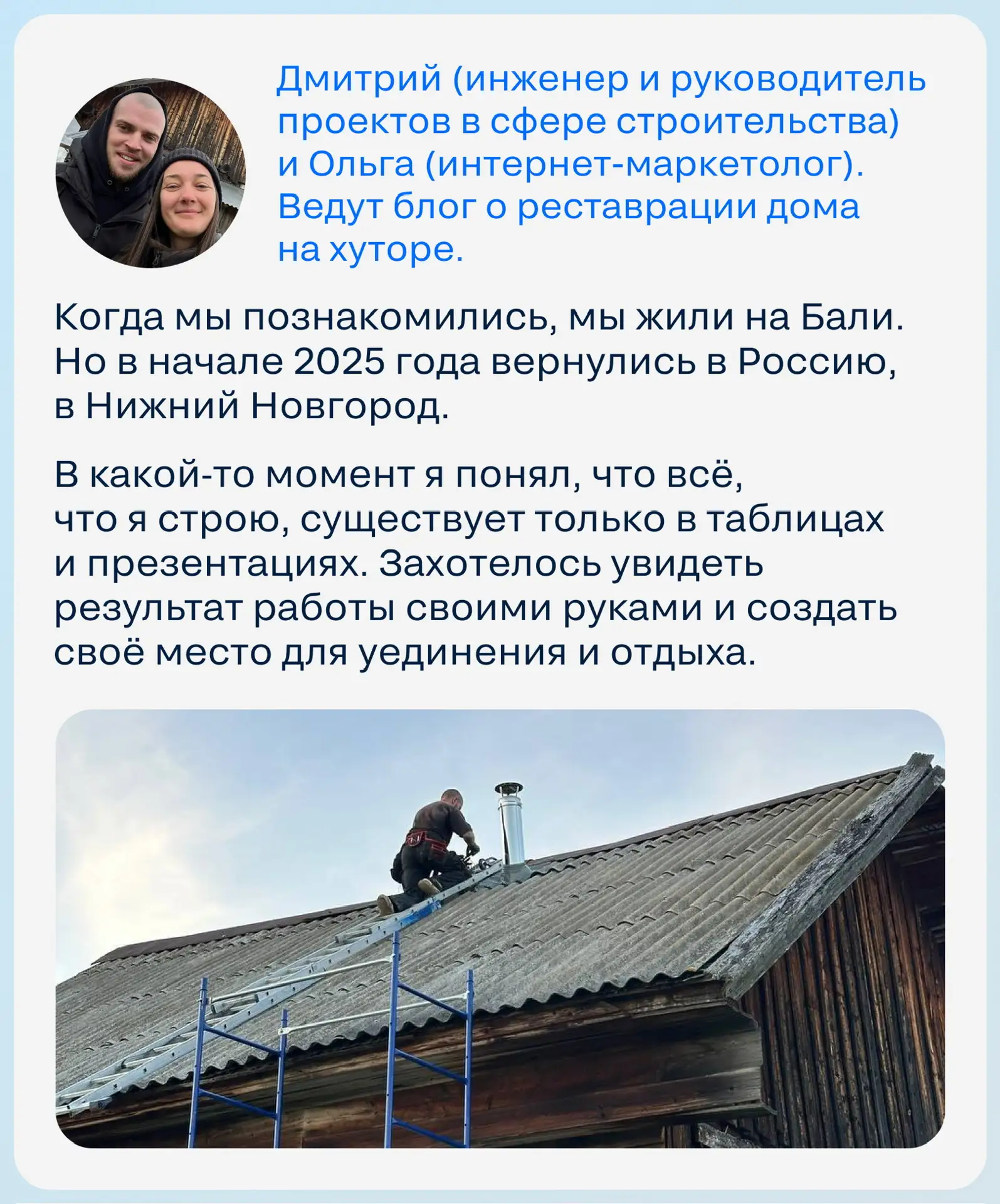 🏠 Что, если сделать место для отдыха и уединения на старом хуторе в глуши? Наши новые герои Дмитрий и Ольга именно так и поступили — купили заброшенный дом в Нижегородской области и начали его восстанавливать.