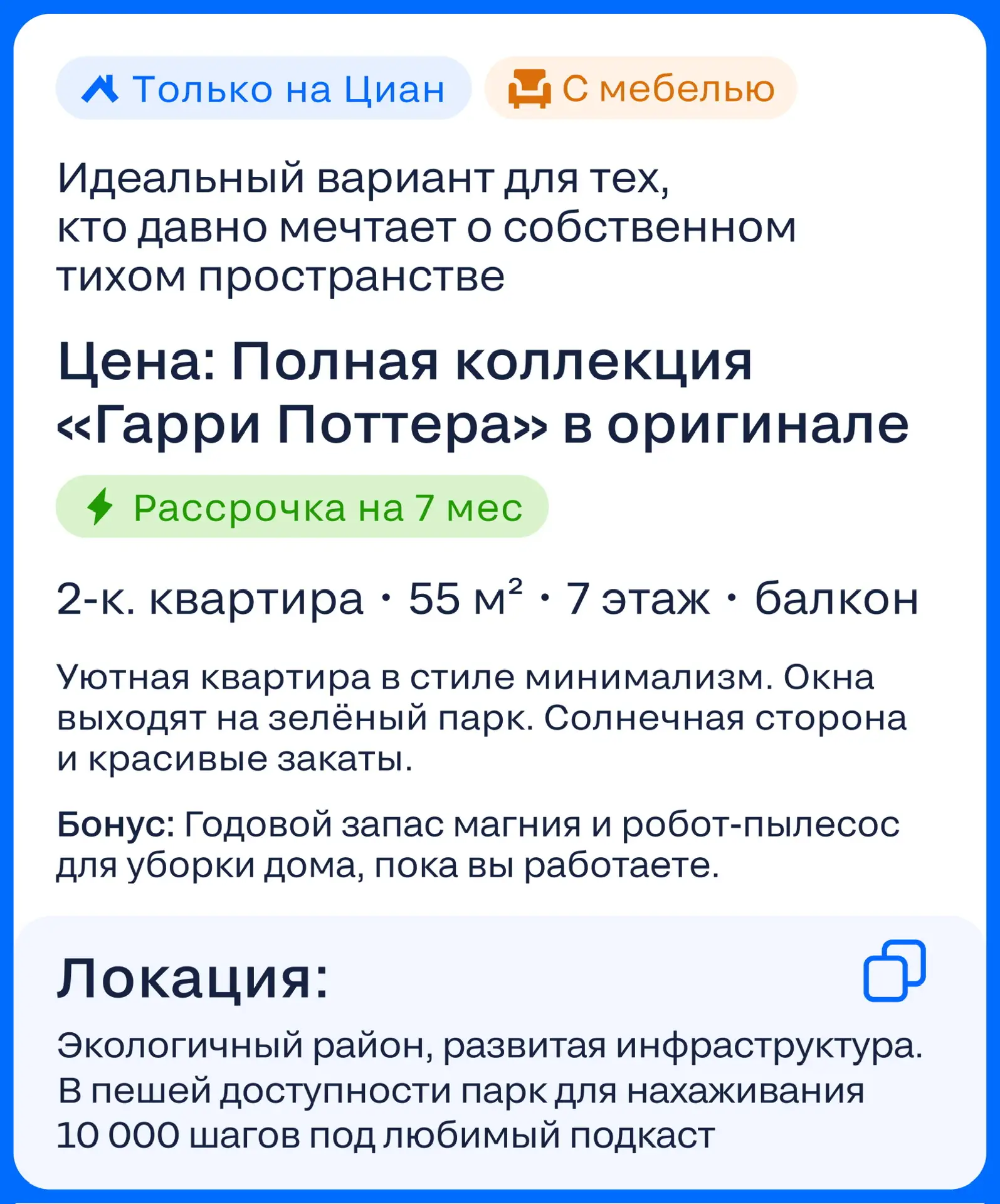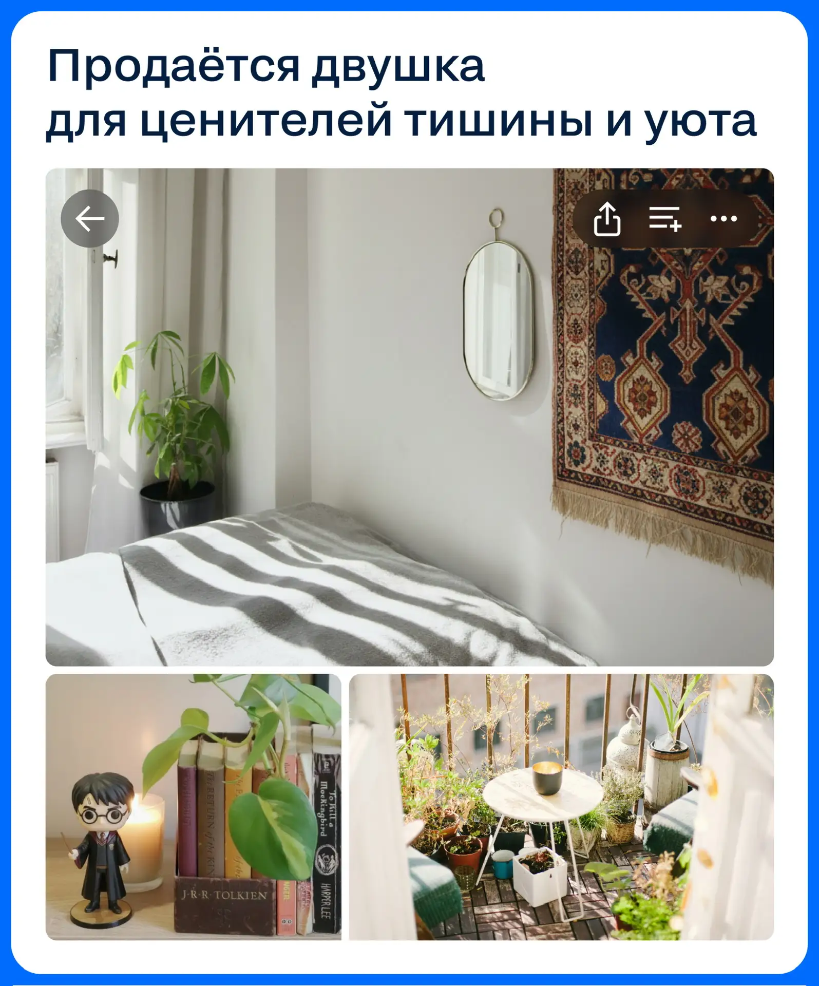 Объявления выглядели бы так: вид из окна на закаты и полная тишина. Минимум лишних вещей, максимум уюта, винтажный ковер как у бабушки и стеллаж с книгами и атрибутами из любимых с детства фильмов и сериалов.