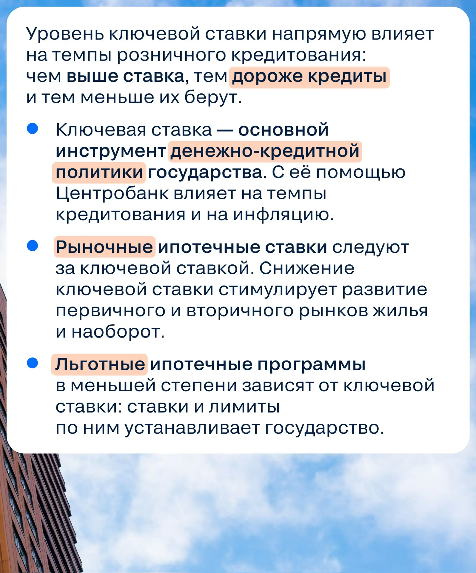 ➡️ Уровень ключевой ставки напрямую влияет на темпы кредитования: чем выше ставка, тем дороже кредиты и тем меньше их берут. Разбираемся, зачем нужна ключевая ставка и почему её повышение делает ипотеку менее доступной, а вклады и депозиты — более выгодными.