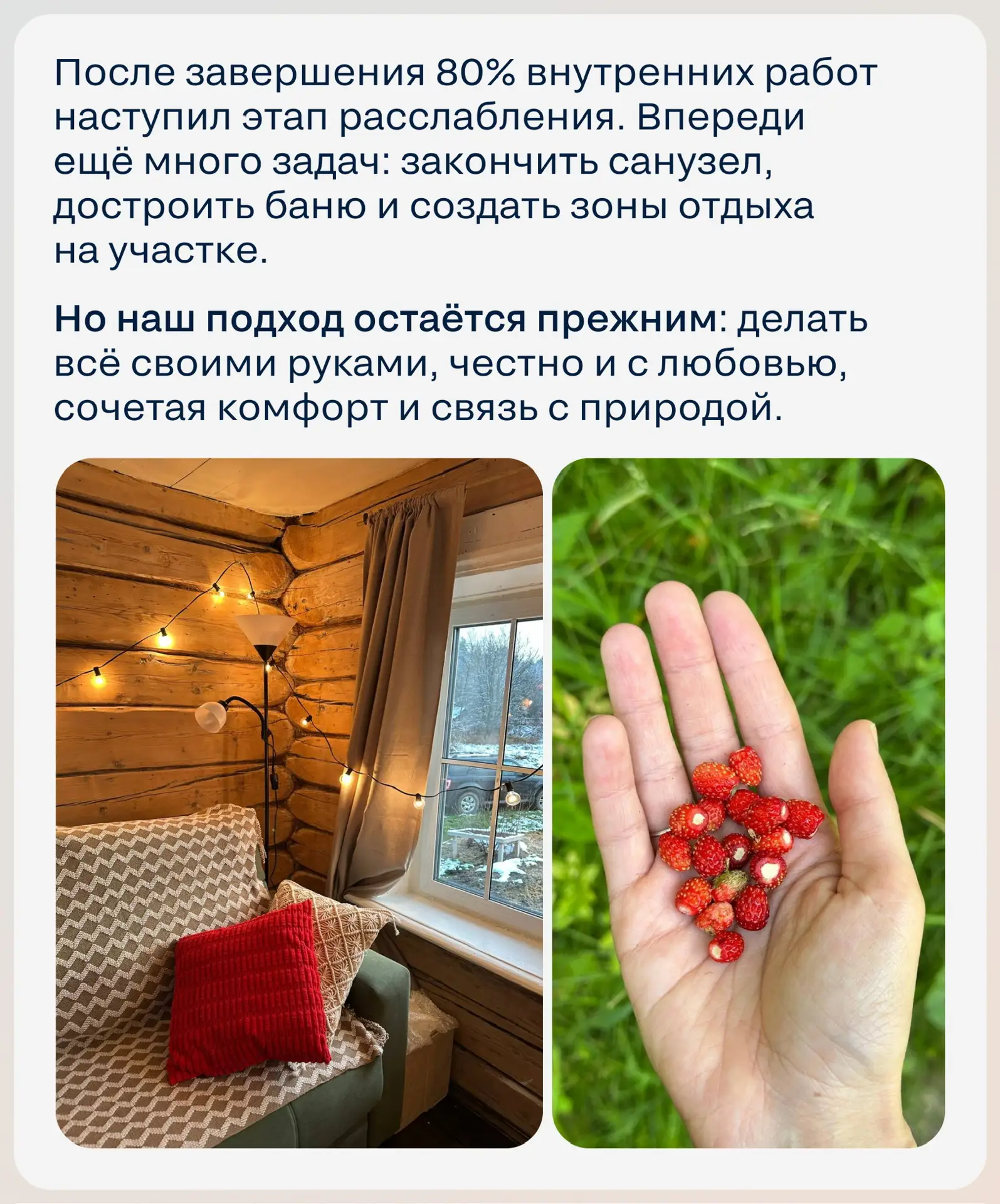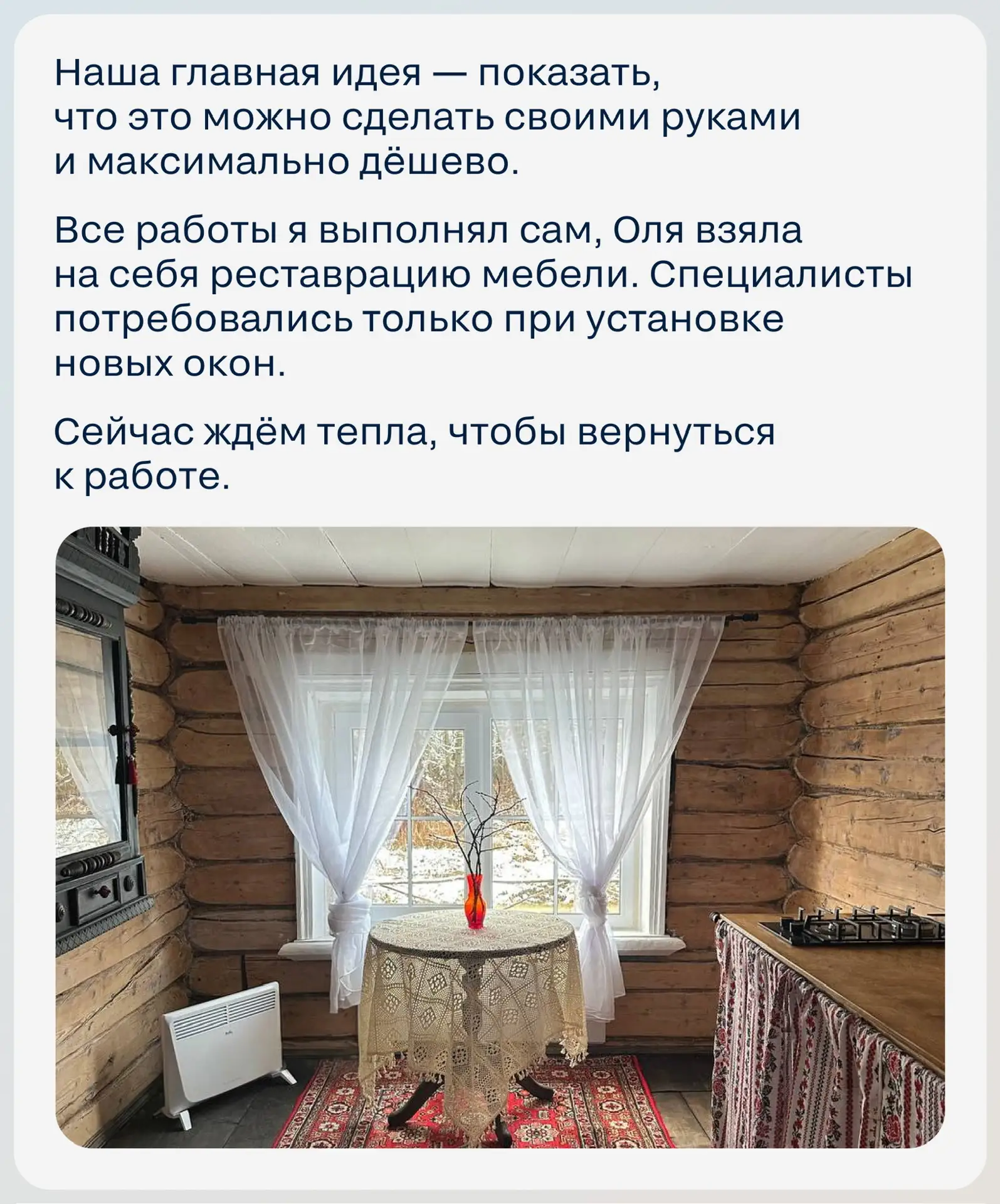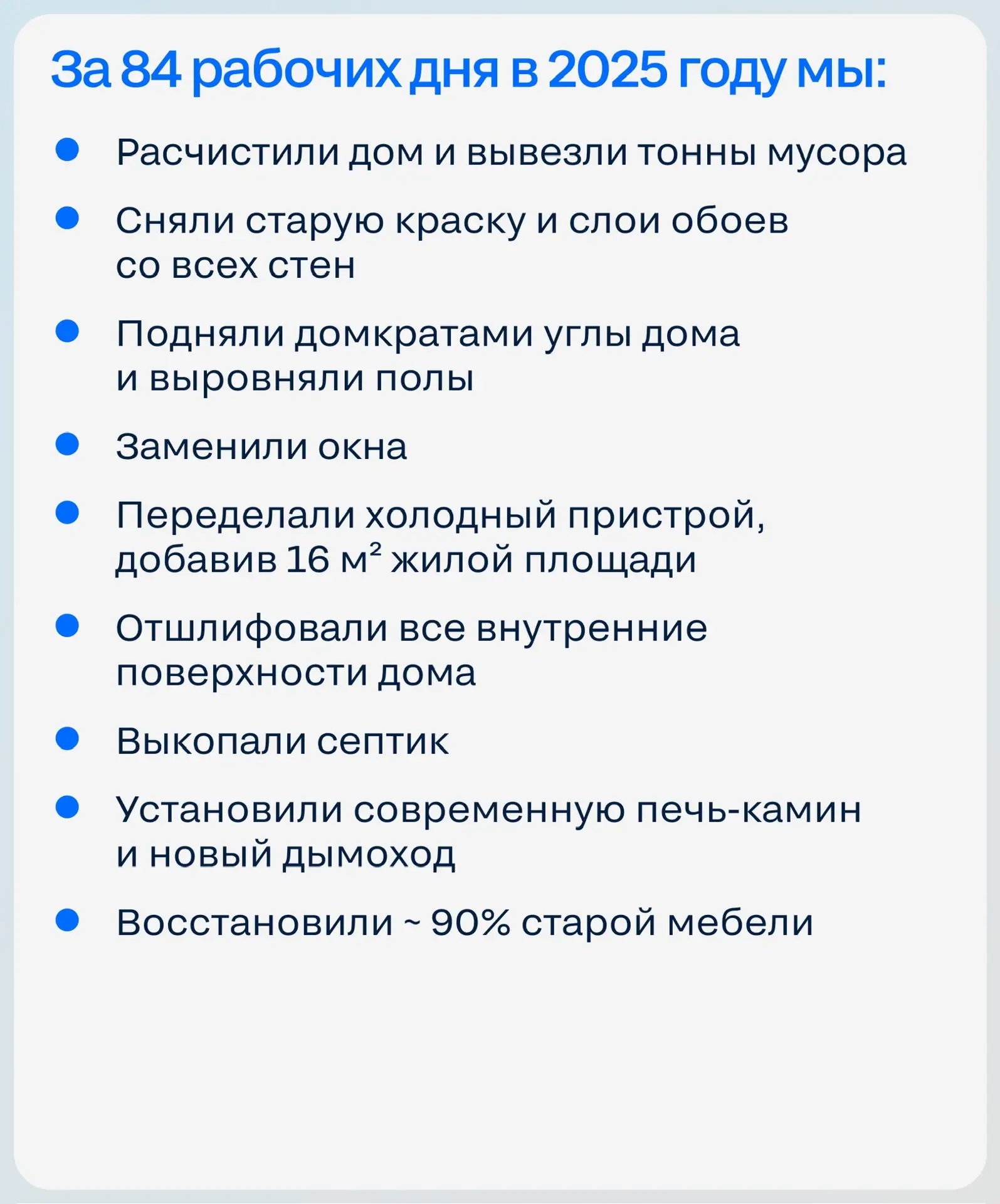 ➡️ Они поделились с нами своим опытом: что удалось сделать за 84 рабочих дня, как отреставрировать дом своими руками с минимальными затратами и как совместить деревенскую атмосферу с современным комфортом.