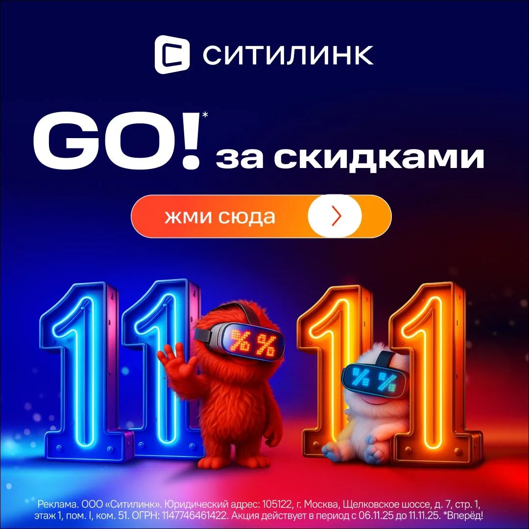 До 11.11 в Ситилинке скидки до 55% на всё, что делает жизнь мощнее: от видеокарт и ноутбуков до топовых смартфонов и ТВ. Не тормози — время апгрейда пришло!