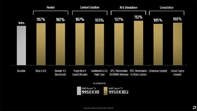 По сравнению с Ryzen 9 9950X3D новинка обеспечивает на 5–10% более высокую производительность в таких приложениях, как DaVinci Resolve, Blender, Unreal Engine и других.