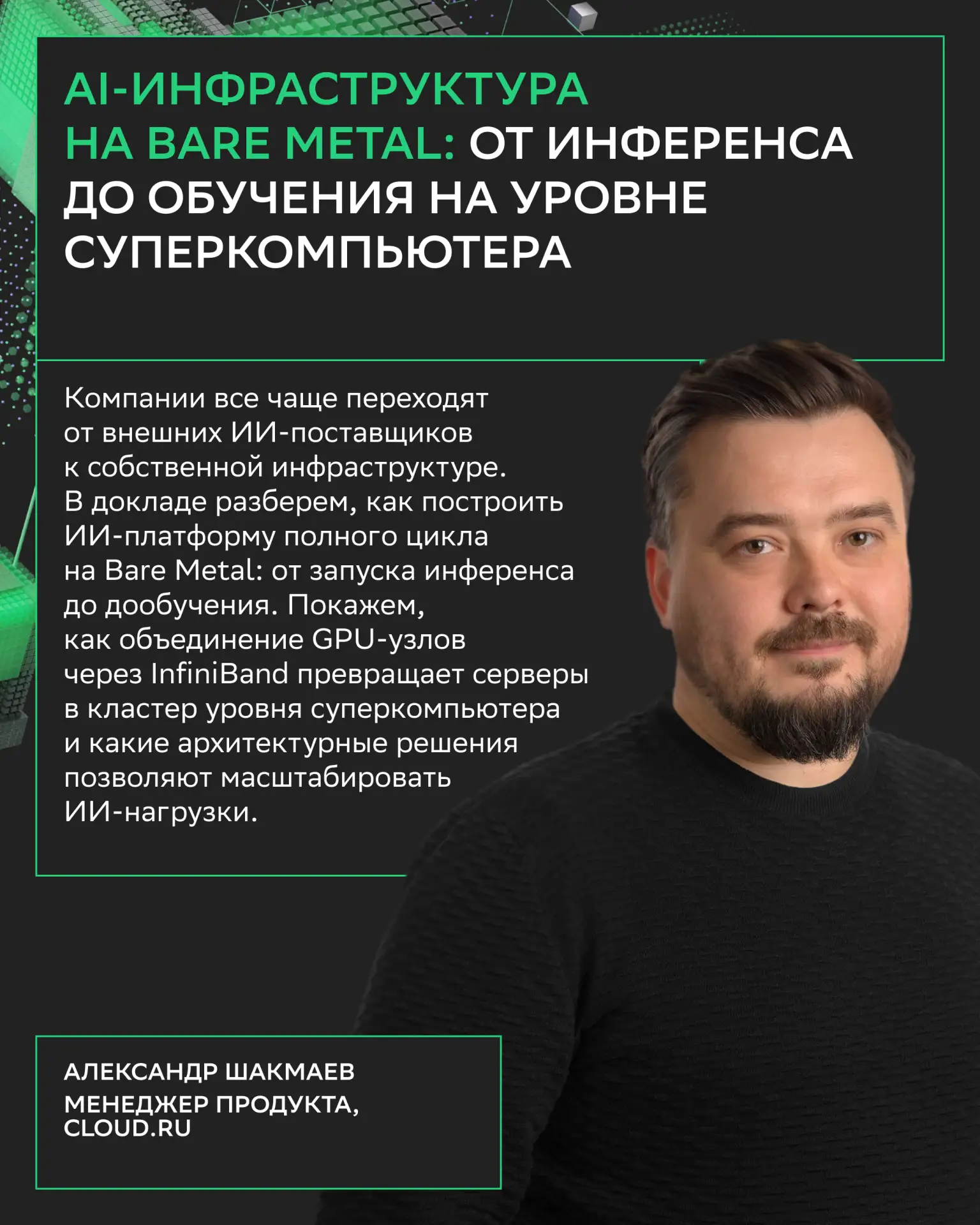 9 апреля мы соберем в одном месте IT-руководителей, топ-менеджеров, инженеров, разработчиков и лидеров мнений, чтобы поговорить про AI и облака, обменяться опытом и лучшими практиками.