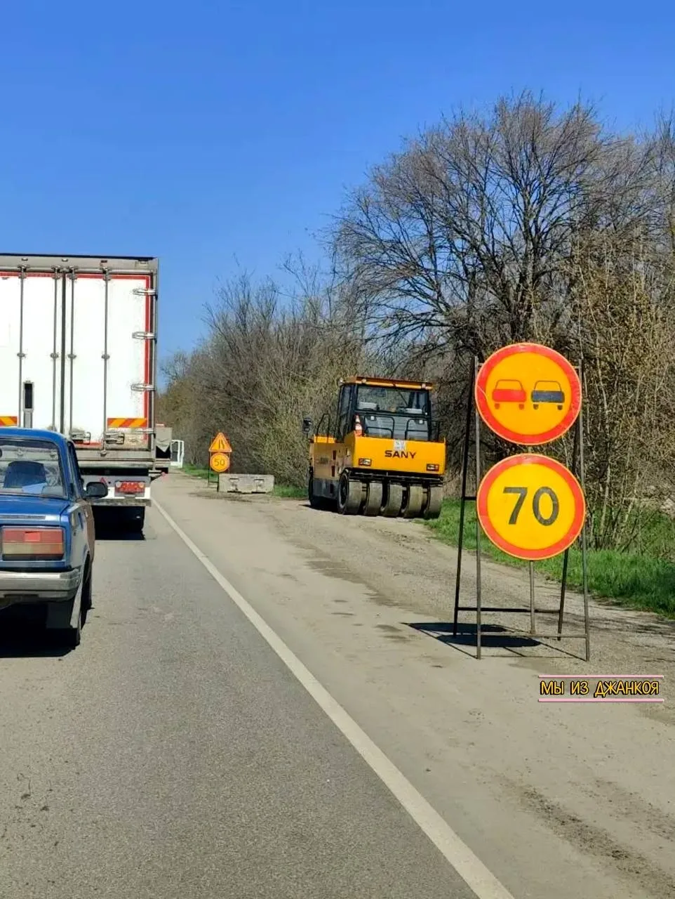 В сторону Чонгара, сразу за посёлком Изумрудное, сняли слой асфальта и начали дорожные работы. На участке организовано реверсивное движение.