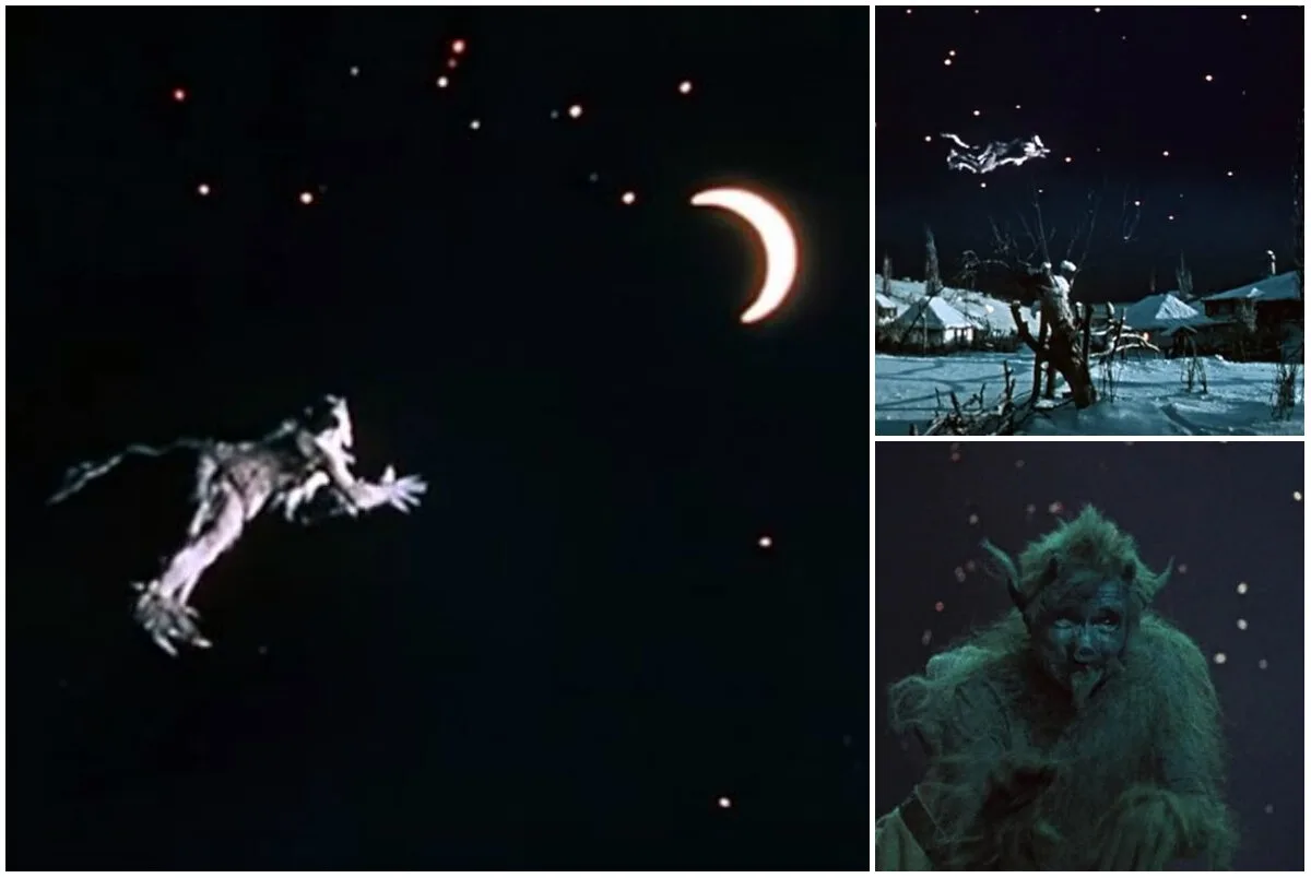 Сцену с полетом черта снимали на фоне черного бархатного полотна, на который были прикреплены искусственные звезды.