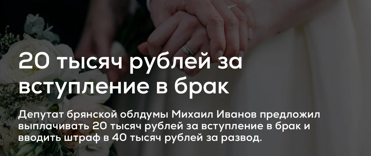 Депутат брянской облдумы Михаил Иванов предложил выплачивать 20 тысяч рублей за вступление в брак и вводить штраф в 40 тысяч рублей за развод.