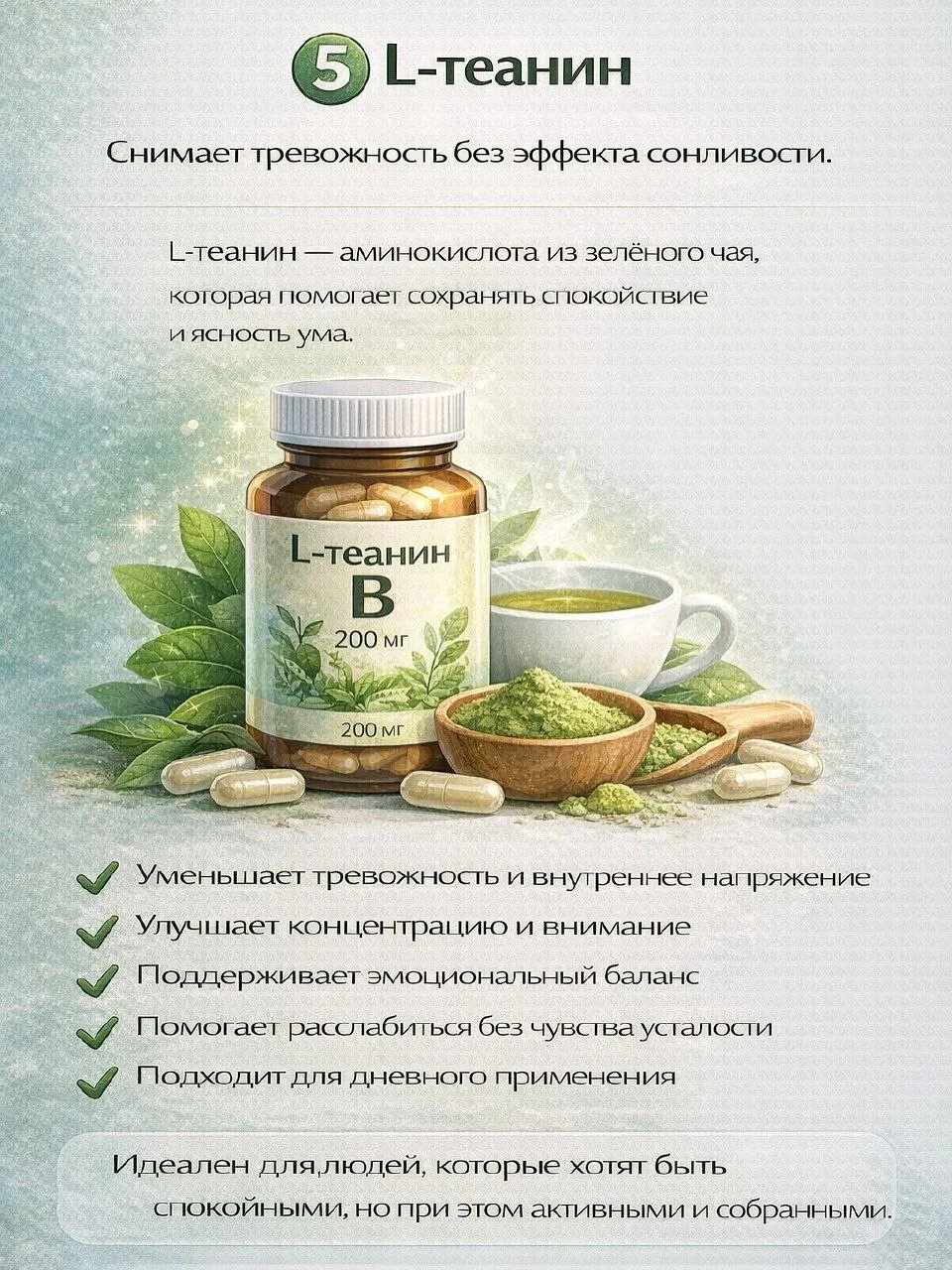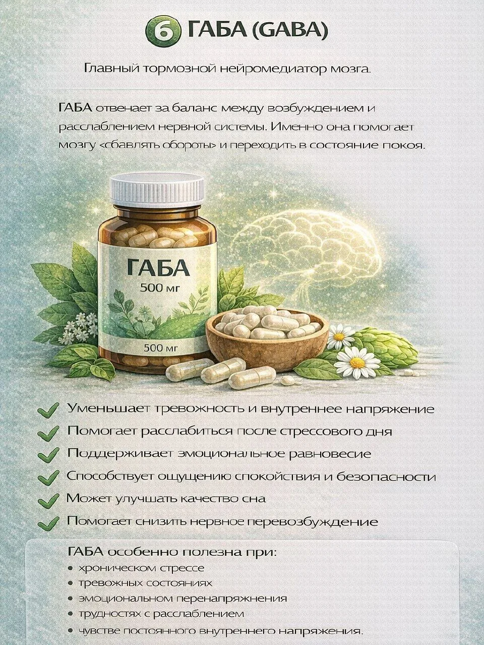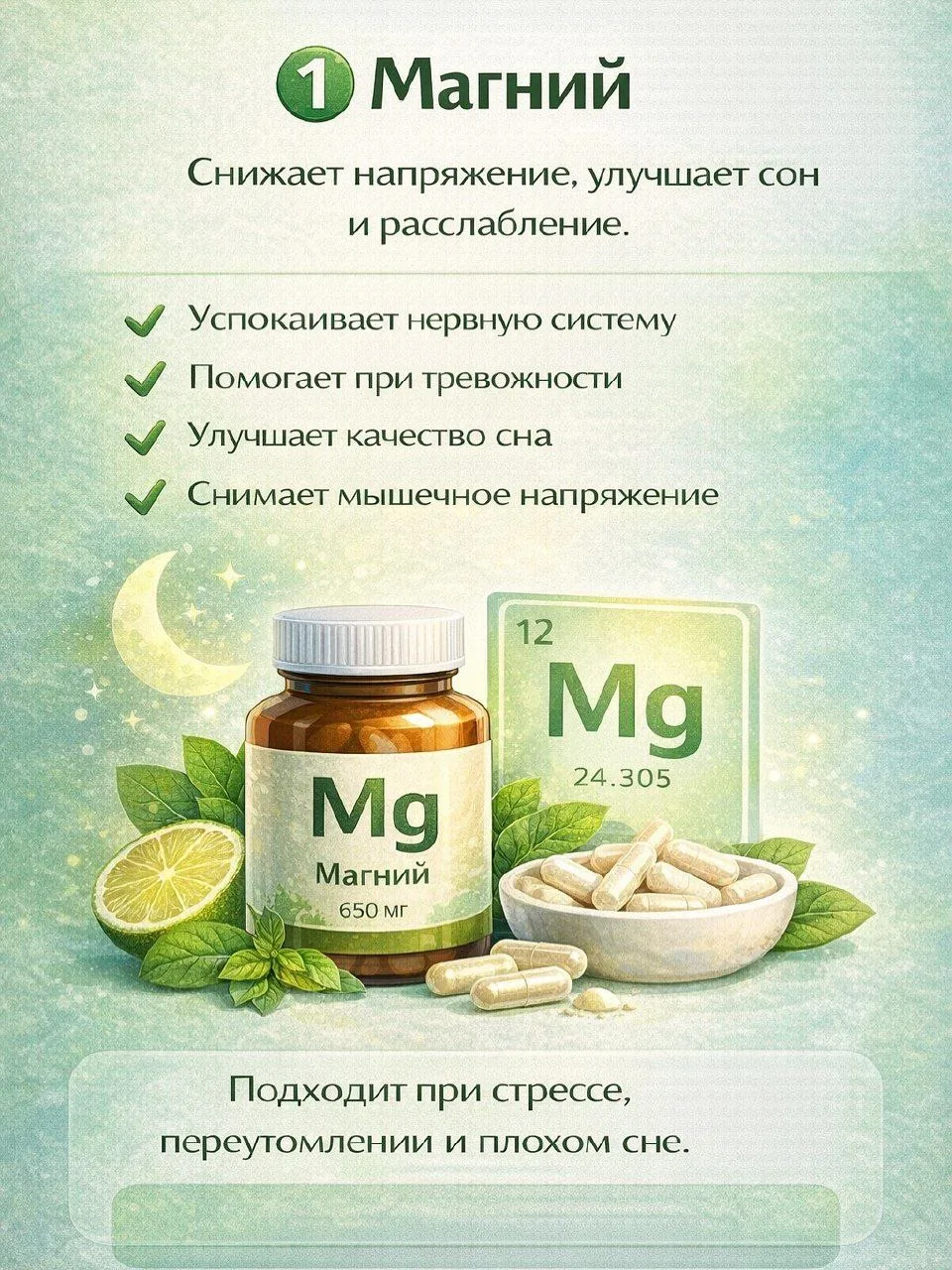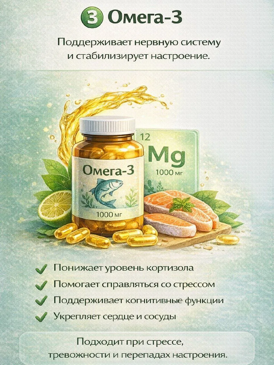 магний, ашваганда, омега-3, витамины группы B, L-теанин, GABA.