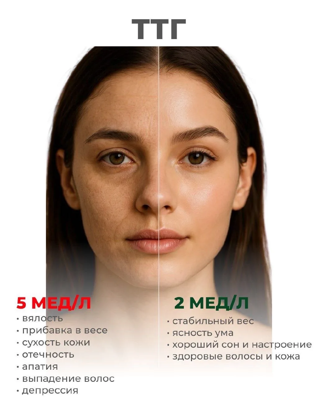 • ТТГ — повышается при сниженной функции щитовидной железы, замедляет обмен веществ и приводит к набору веса