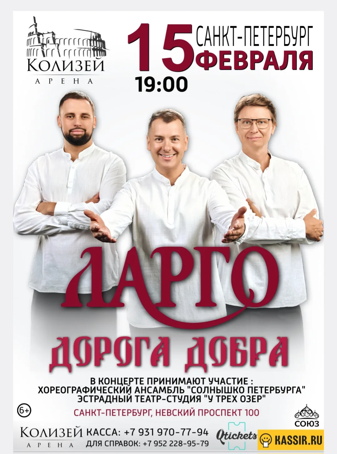15 февраля 2026 года состоится уникальное музыкальное событие — концерт арт-группы «Ларго», который пройдет в великолепном концертном зале — «Колизей арена» Этот концерт обещает стать настоящим праздником для ценителей музыки различных стилей, а также для тех, кто ищет вдохновение и внутреннюю гармонию.