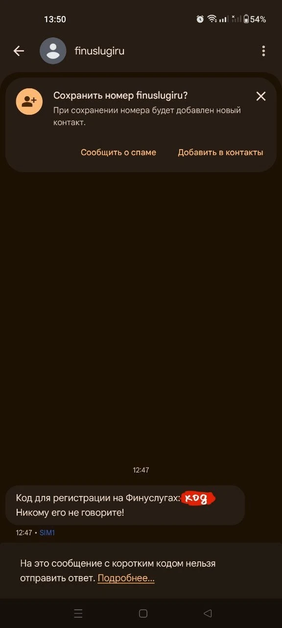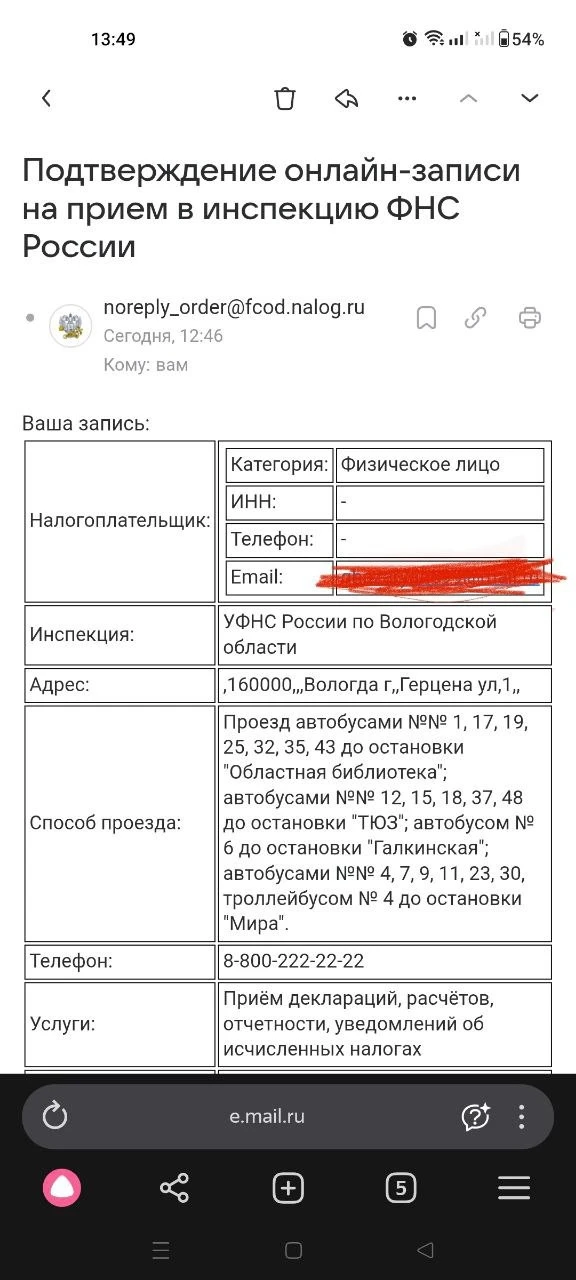 Начинает мне объяснять что вот по этому адресу надо пройти, в налоговую службу, там будет инспектор к которому он меня щас привяжет, отправляет на мою почту письмо с "информацией" (почту я ему тоже не называла) и я уже читаю что там написано. Он пытается всячески меня отвлечь что бы я вникала в суть письма и отправителя но к его несчастью художника не обманешь липовым логотипом налоговой службы, исполненным в совсем других цветах. А я уже получала письмо от налоговой службы и знаю какой у них логотип. Так же и название адреса отличается лишним словом fcod. Его "информация" абсолютно отсутствовала. Он поленился для вида даже заполнить то что прислал мне. Начинает плести что вот это письмо надо показать инспектору + я щас отправлю код, надо бы его сохранить и тоже показать инспектору. Отправляет на мой телефон код и я убеждаюсь окончательно что мужчина с гнильцой. Финуслуги - регистрация. Просит назвать код, я ему отвечаю, что сейчас как раз в участке сижу жду своей очереди, передам трубку инспектору пусть он подтвердить свою личность (ну мало ли), от чего он сразу же меня посылает на три буквы и бросает трубку 🤣 Вот так вот.