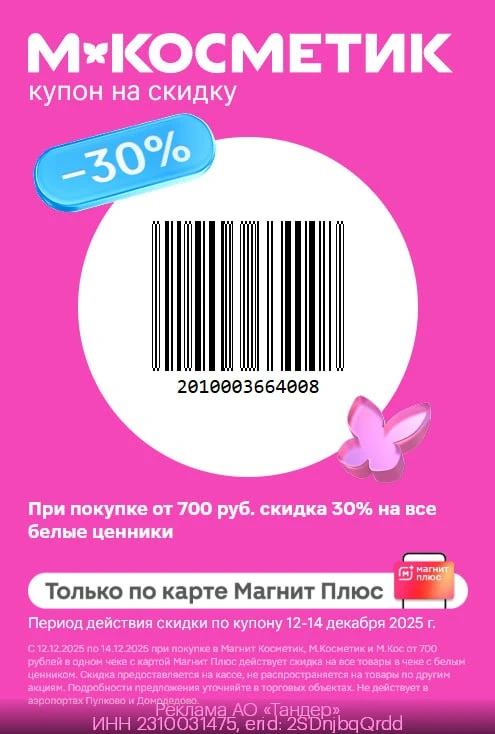 Покажи КУПОН в Магнит Косметик, вместе с картой Магнит, получи скидку 30% на товары с белым ценником при чеке от 700 руб.!
