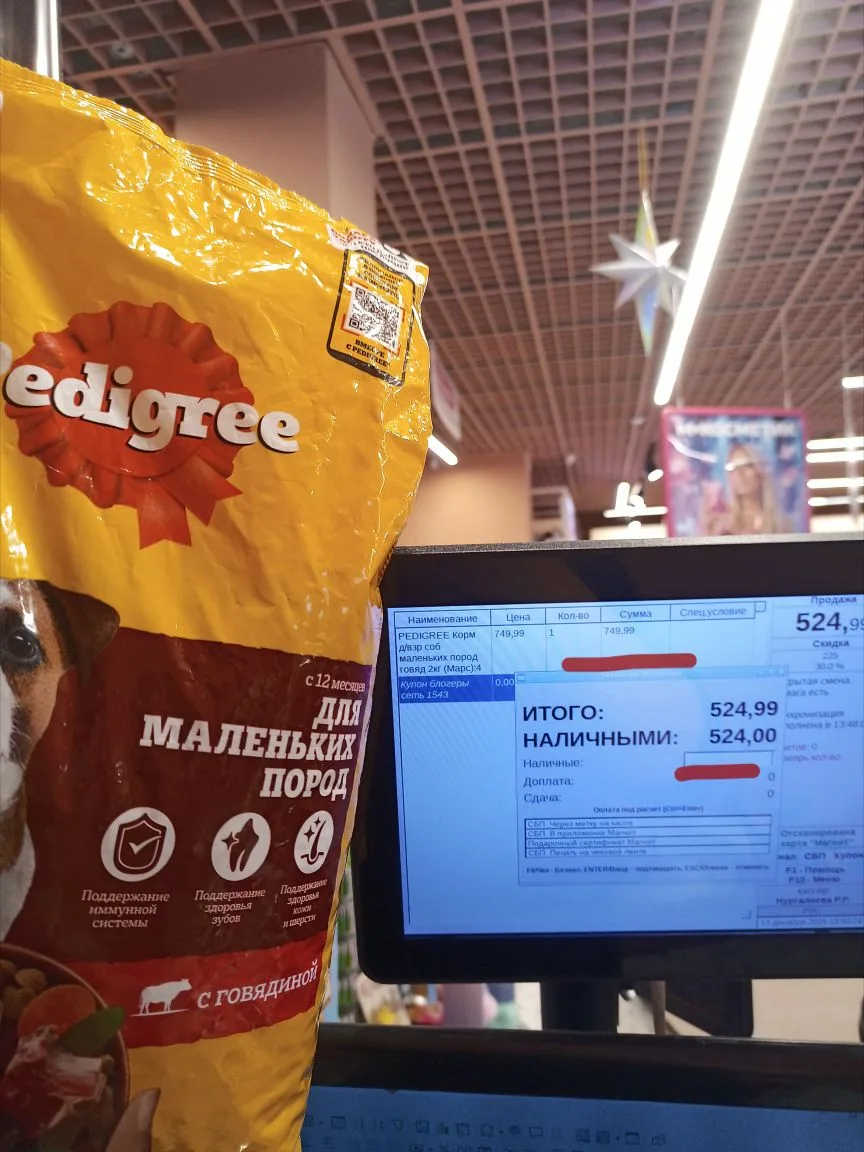 👛Сейчас пробила корм pedigree, вместо цены на ценнике 750 р, на кассе с купоном и картой Магнит вышел 524 руб!
