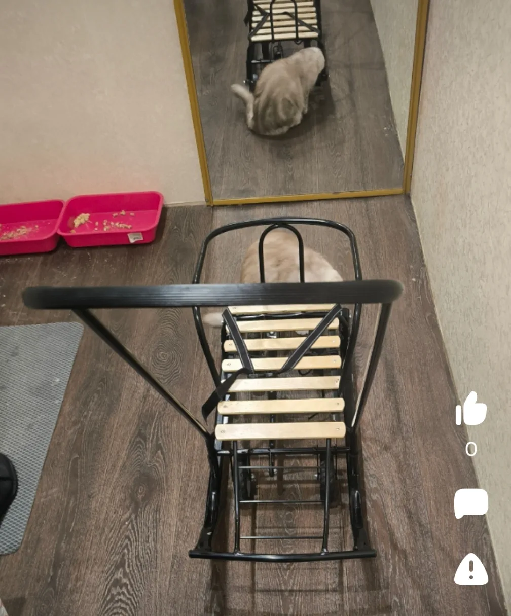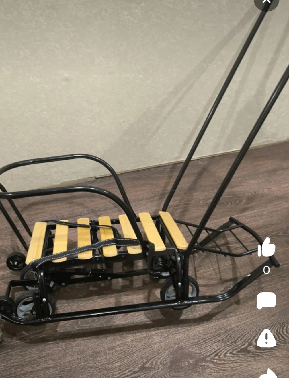 Ручка на обе стороны, полозья и колёса, ремни безопасности.
