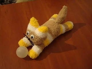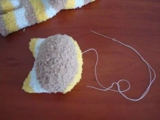Мордочку стягиваем внизу.Пришиваем голову и хвостик.Глазки приклеила готовые (можно пришивать пуговицы).Нос из черной бусинки и ниточек.