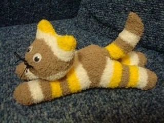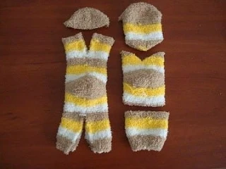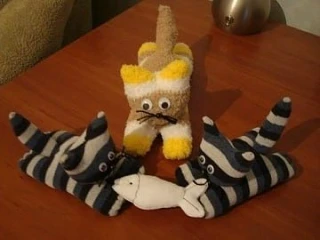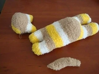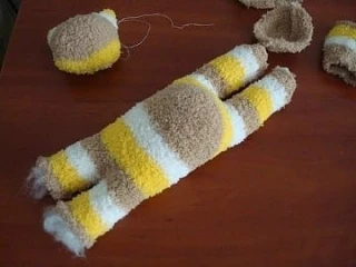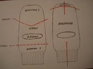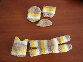 Передние лапки разрезаем чуть меньше, чем задние. Из первого носка - туловище и хвостик, из второго-мордочка и две шапочки.Это изнаночная сторона носков.
