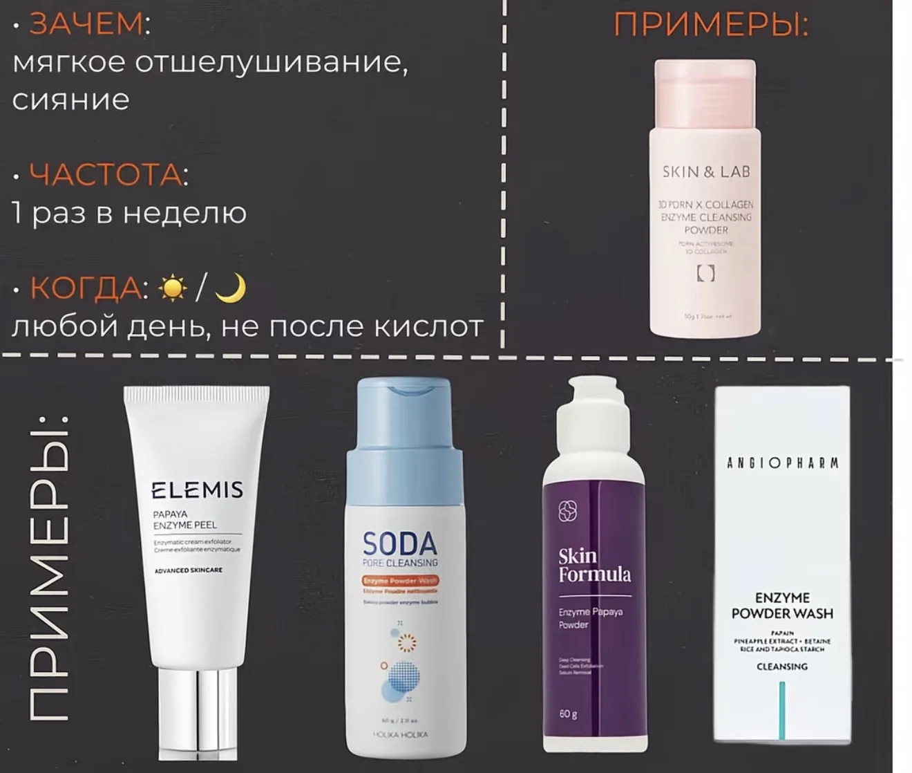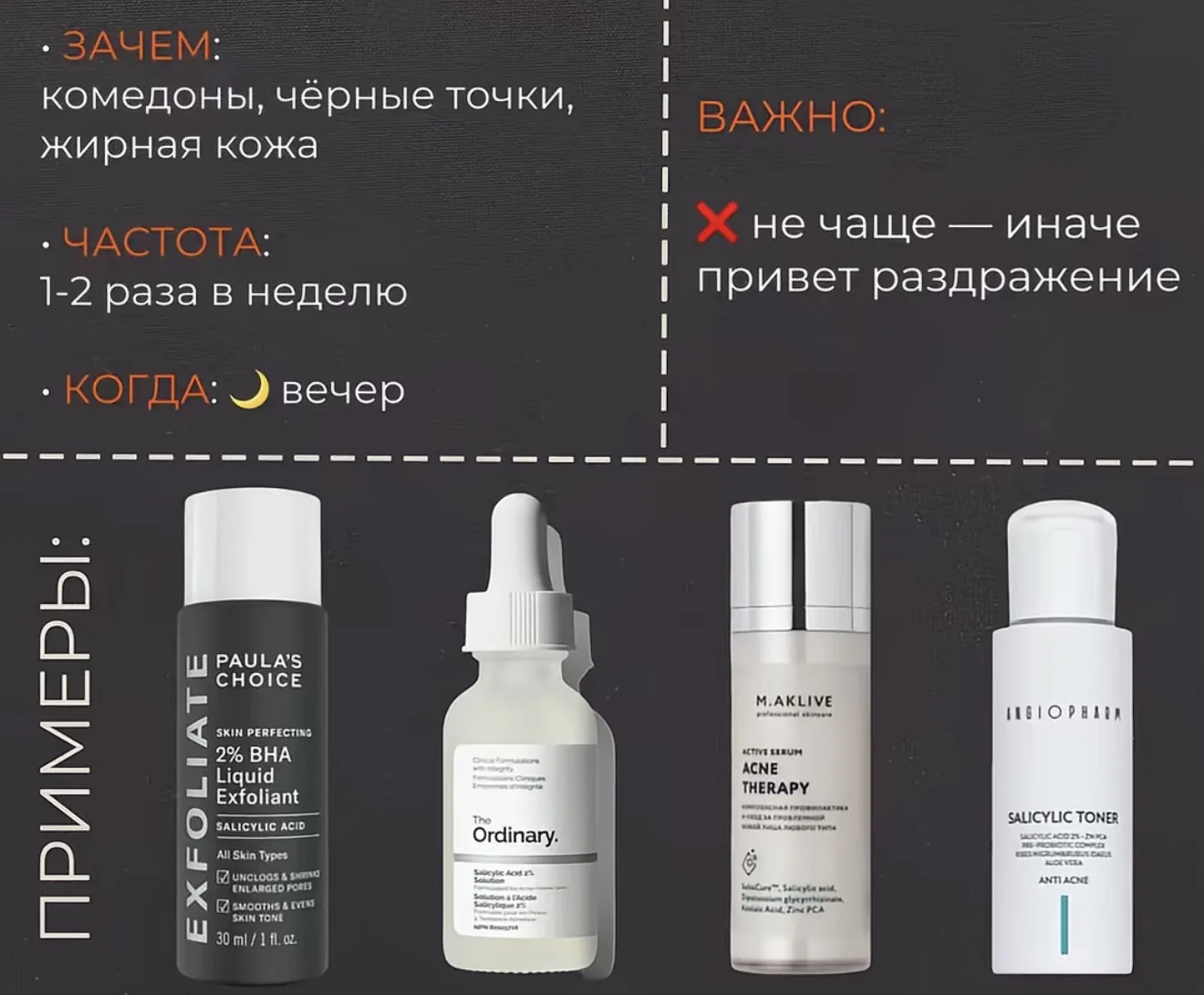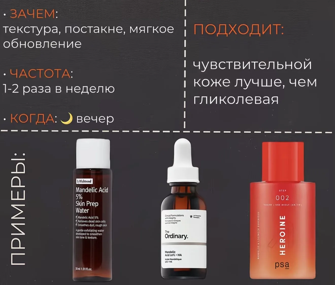 4. Химические эксфолианты: 1–2 раза в неделю мягкие пилинги (миндальная или молочная кислота), чтобы отшелушивать ороговевшие клетки и выравнивать тон.
