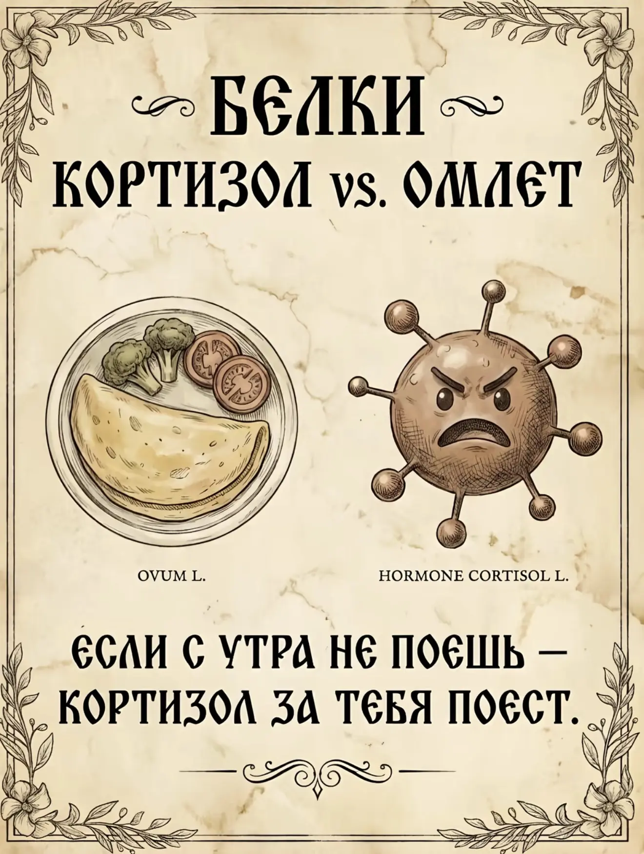 Сразу после пробуждения кортизол и так на пике (это естественный подъём). Но если не дать ему отбой едой, он продолжит разрушать мышцы и запасать жир — тело решит, что наступил голод и стресс.