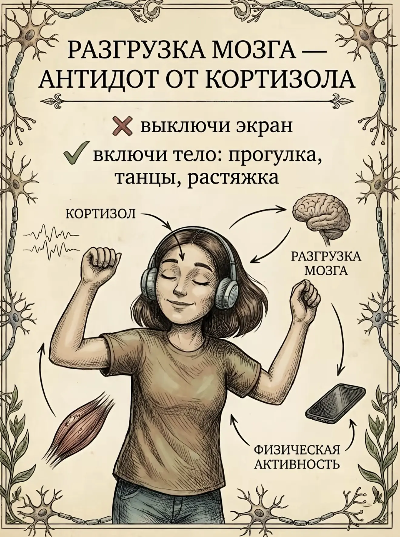 Физическая активность без гаджетов (прогулка, танцы, растяжка) работает сразу по трём фронтам: