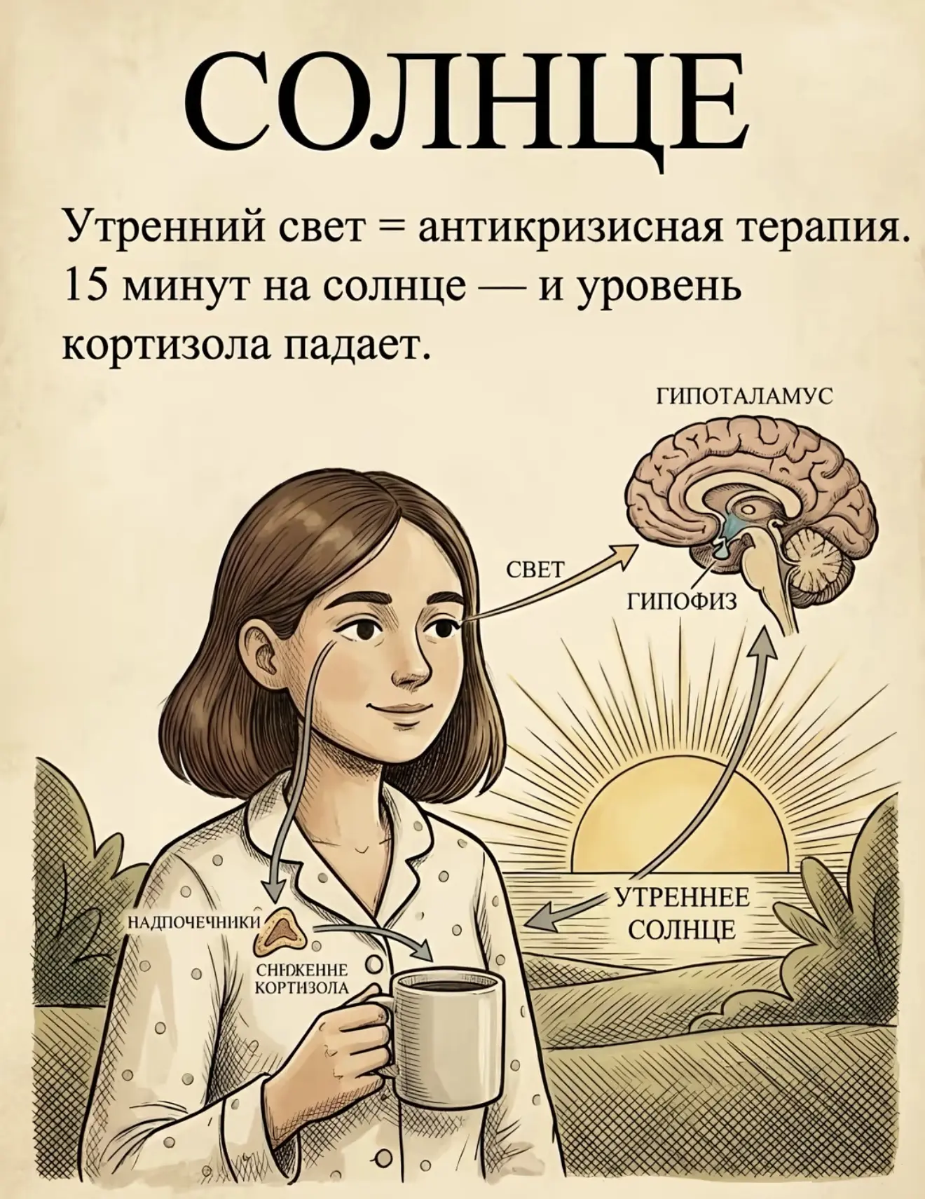 Утренний свет — это сигнал гипоталамусу: «День настал, можно снижать защиту».