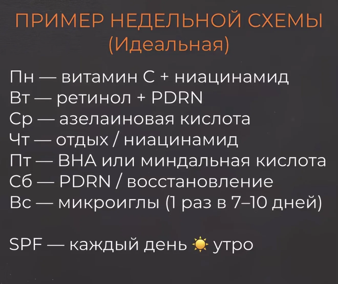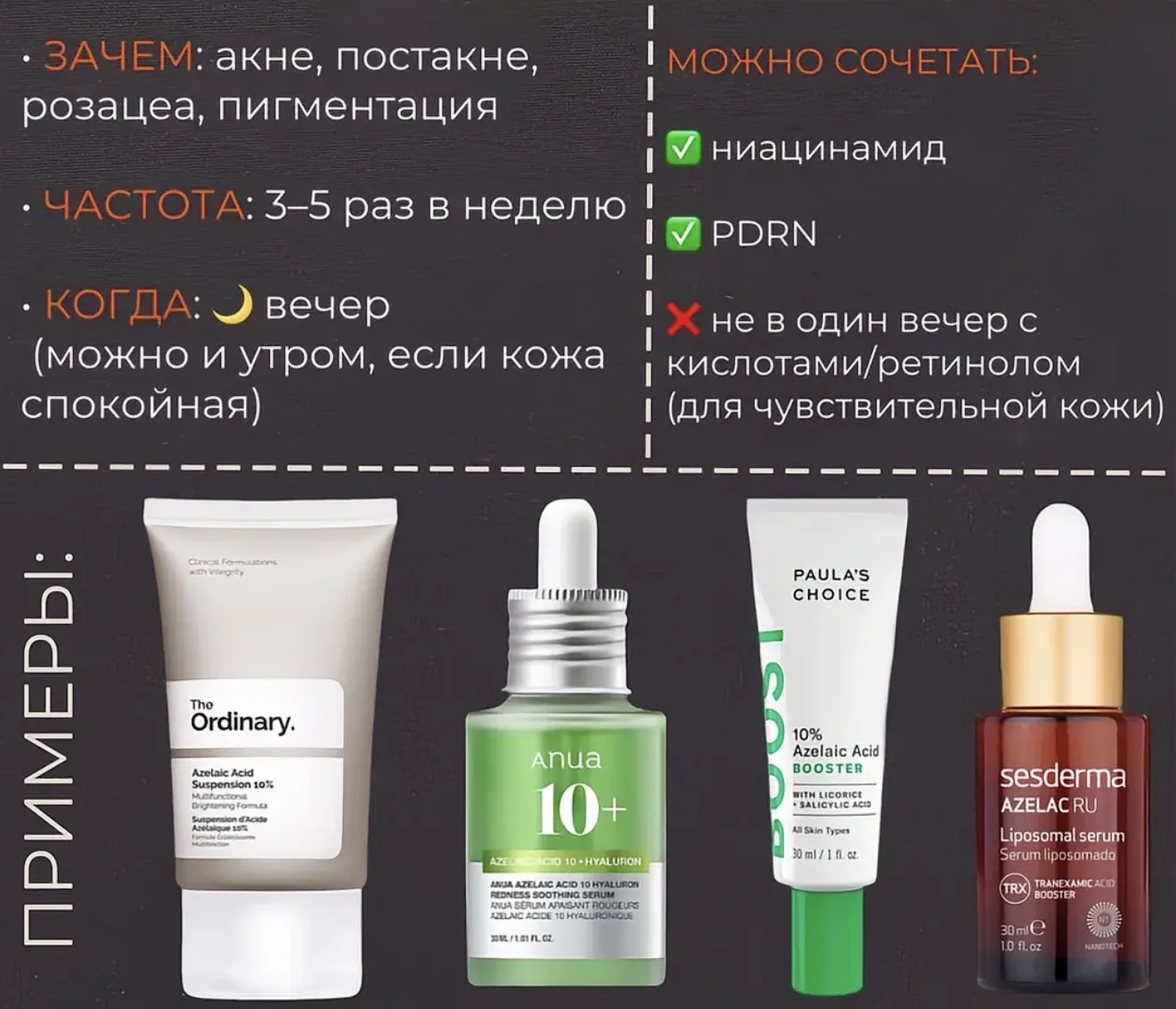 3. Кислоты и ретинол: Продолжаем использовать ретинол (возможно, в более мягкой форме или в комбинации с маслами), а также кислоты для выравнивания тона (пигментные пятна).