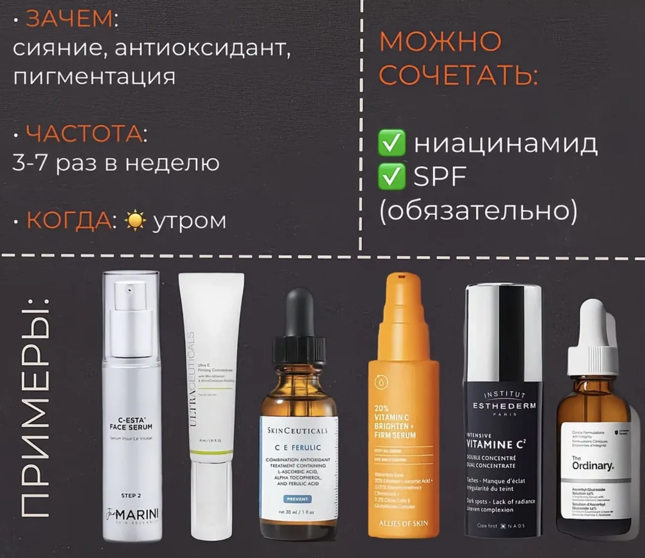 3. Сыворотки: Вводим антиоксиданты (витамин С утром под SPF для сияния и защиты).