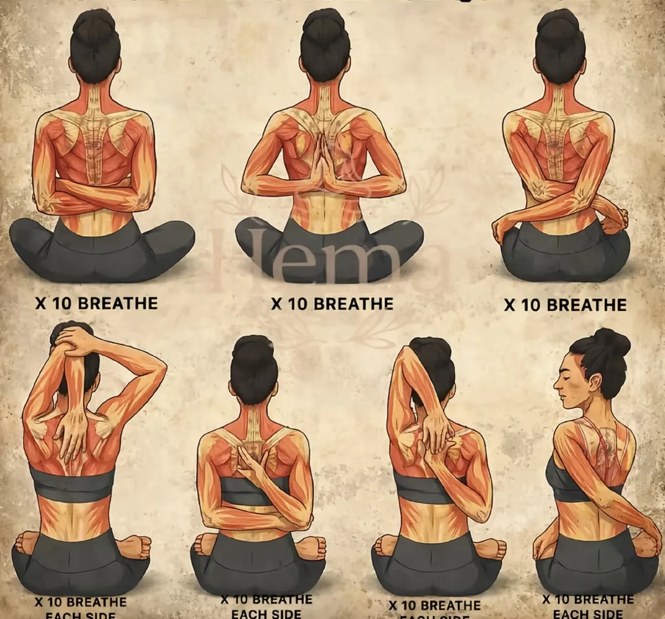 👉 На выдохе медленно сводим локти перед собой до упора. Замираем на 10–15 секунд.