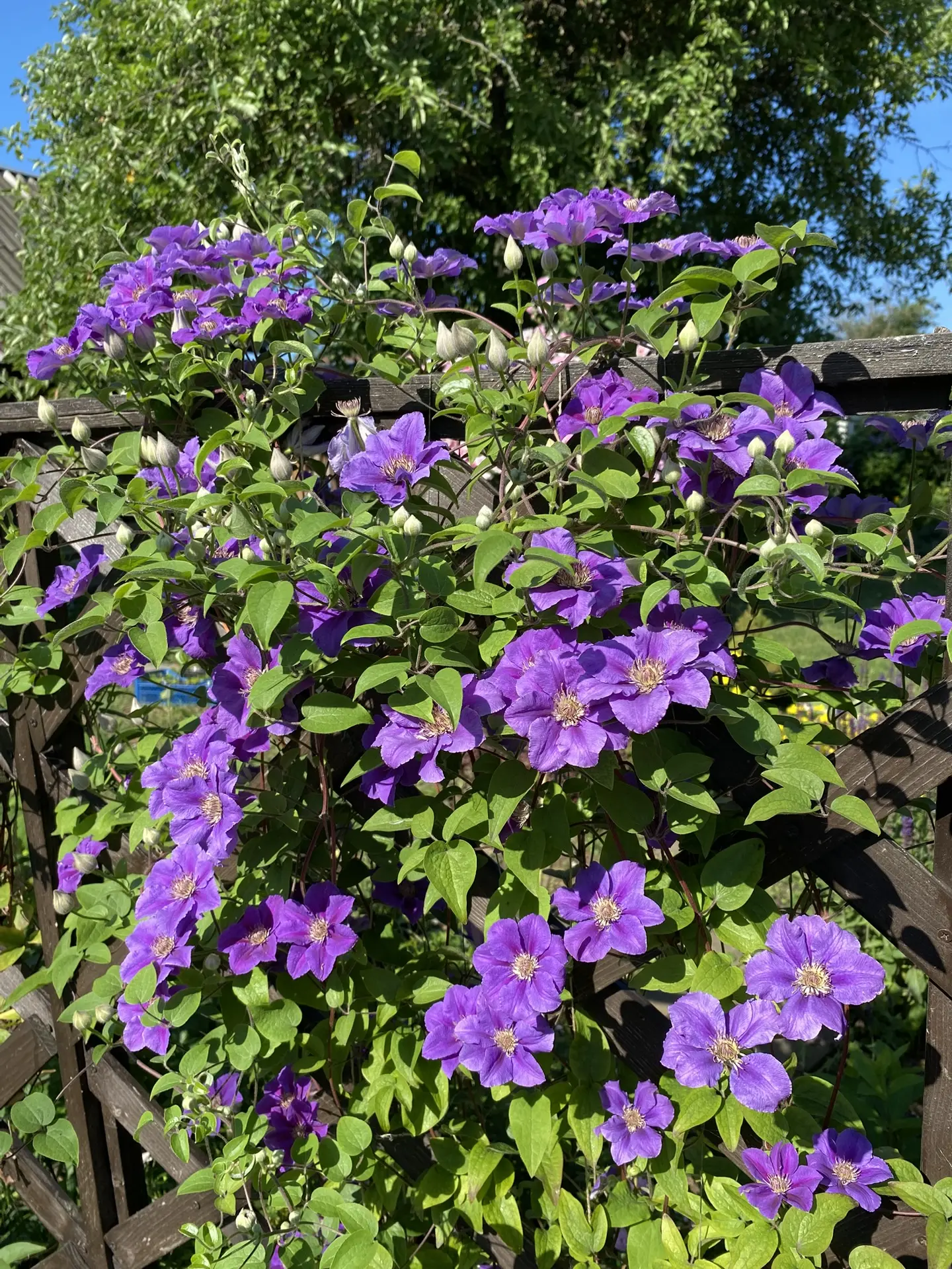 Этот клематис появился одним из первых в моем саду. Сорт неприхотливый, с крупными цветами. В зависимости от условий, погоды окраска цветов может немного отличаться. Если цветение приходится на более пасмурную и прохладную погоду, то цветок более яркий, долго держит такую окраску. В жаркую и солнечную погоду может быстро выгорать. Размер цветка тоже может варьироваться. В иной год цветы огромные, а иногда просто крупные. В общем, этот сорт умеет удивлять, не смотря на то, что растет в саду уже не первый год.