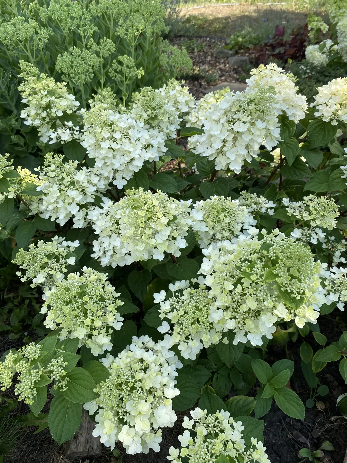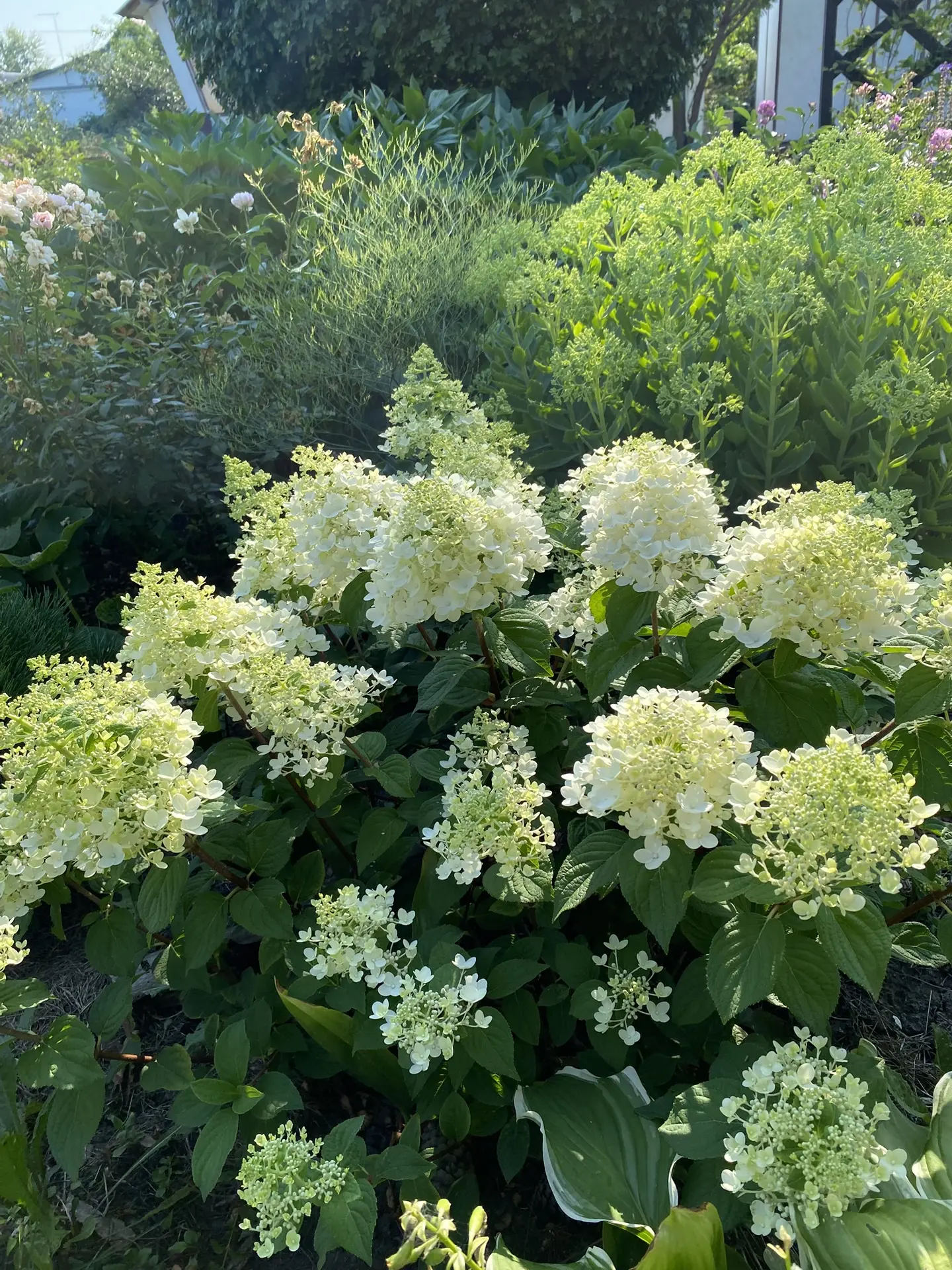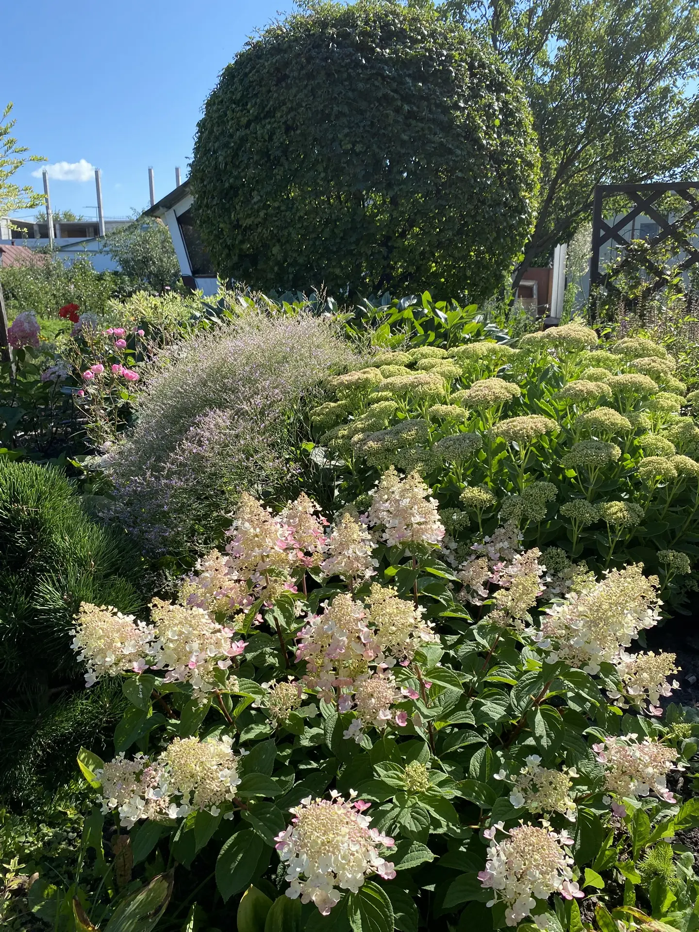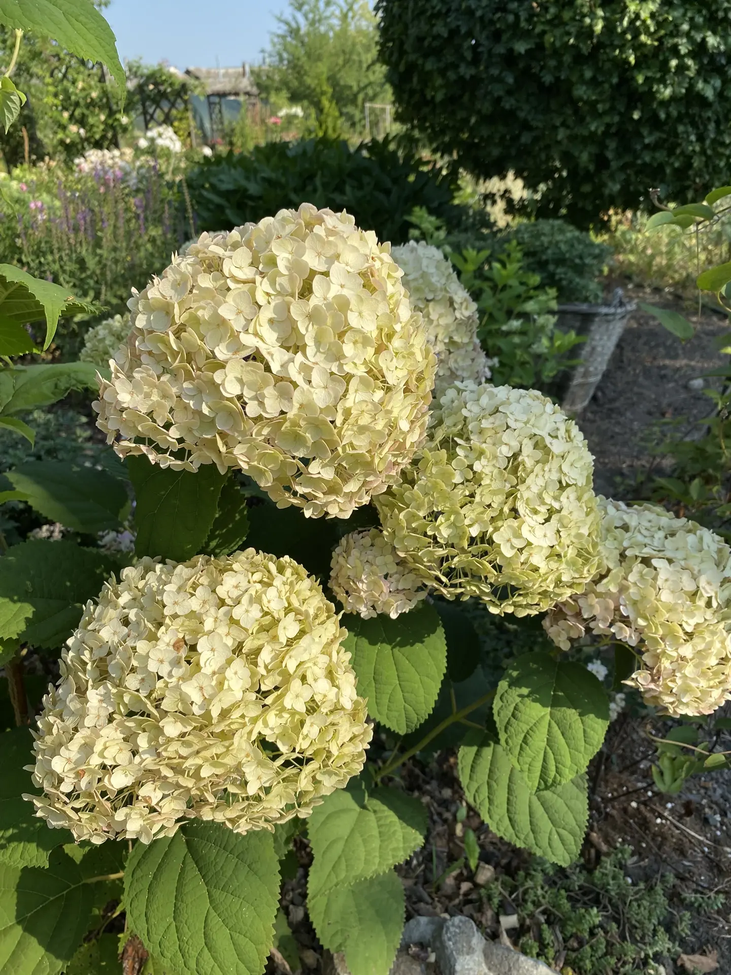 Мой куст находится на полном солнце большую половину дня, примерно до 16 часов. При хорошем поливе ни листья ни соцветия не подгорают, не смотря на то, что температура может быть выше +30 градусов. Поэтому в нашем регионе и севернее вполне можно сажать древовидные гортензии на солнце, если можете обеспечить своевременный полив.